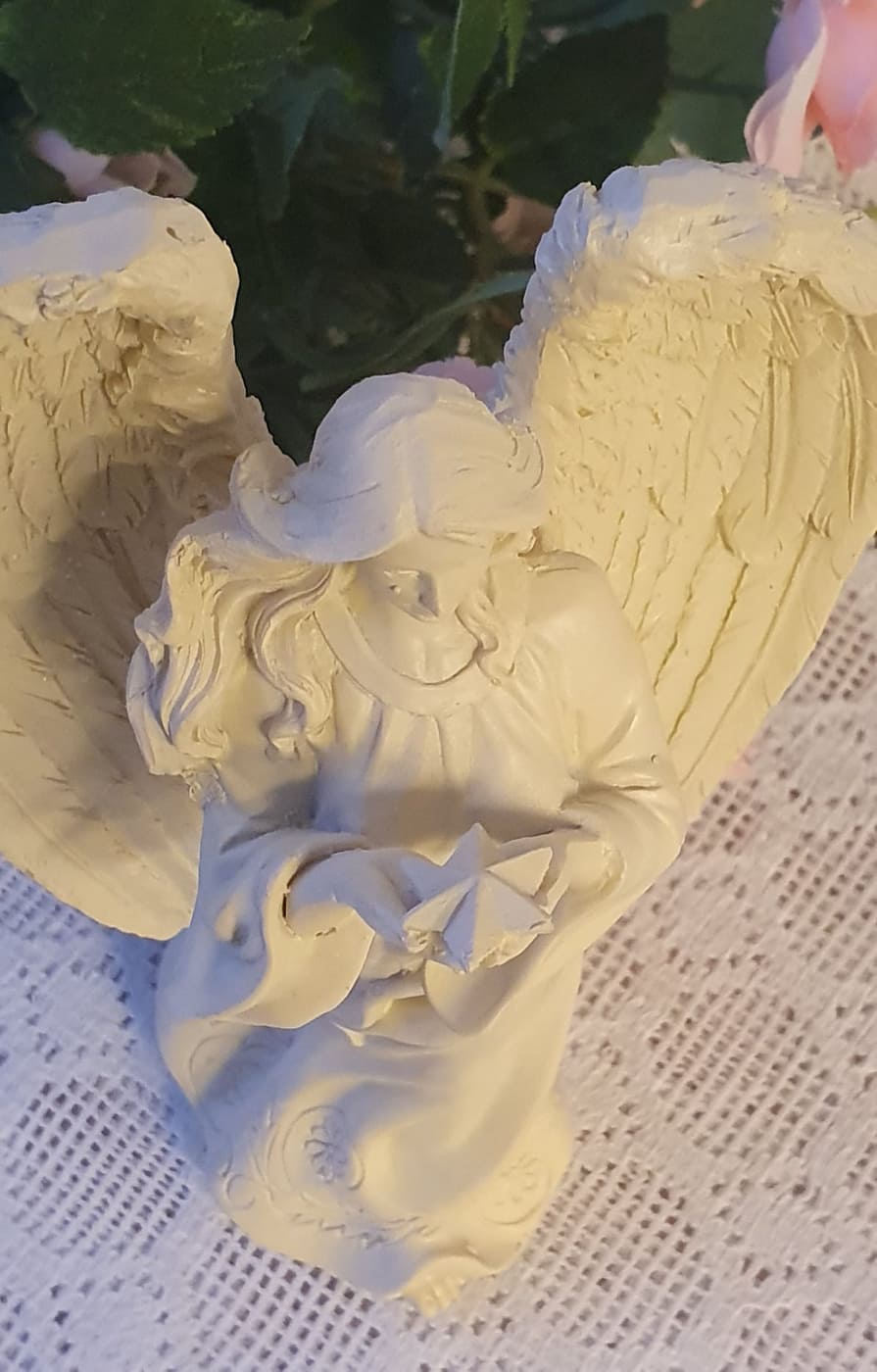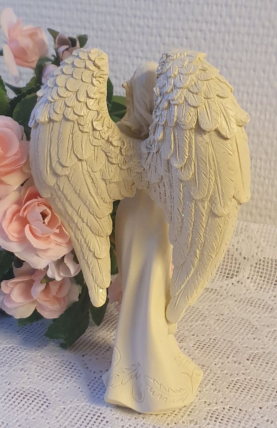 Vacker cremefärgad och glittrande välgjord ängel som håller en stjärna med stora vingar. Vingarna har behandlats med en glitterglasyr som ger en glittrande effekt. Harmonisk ängel som är detalj full och välarbetad, fin från alla håll. Denna ängel kan man placera i vilket rum som helst då den blir en mycket vacker inredningsdetalj. En fantastiskt fin gåva att ge bort eller få.