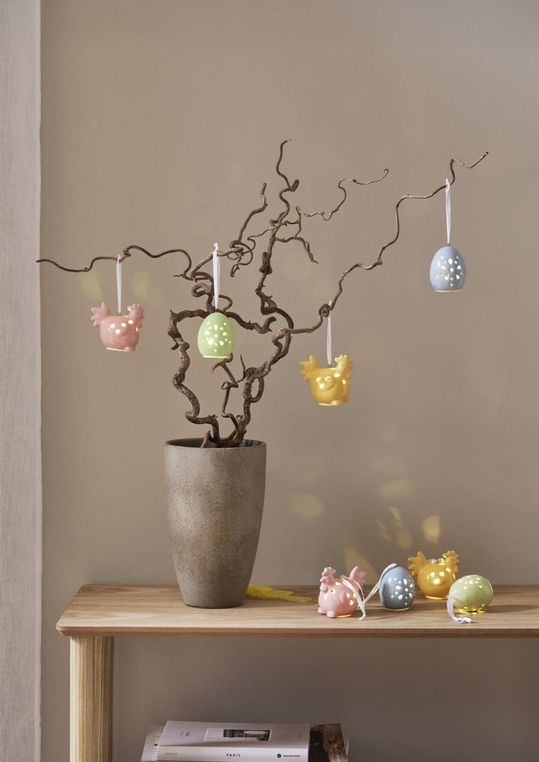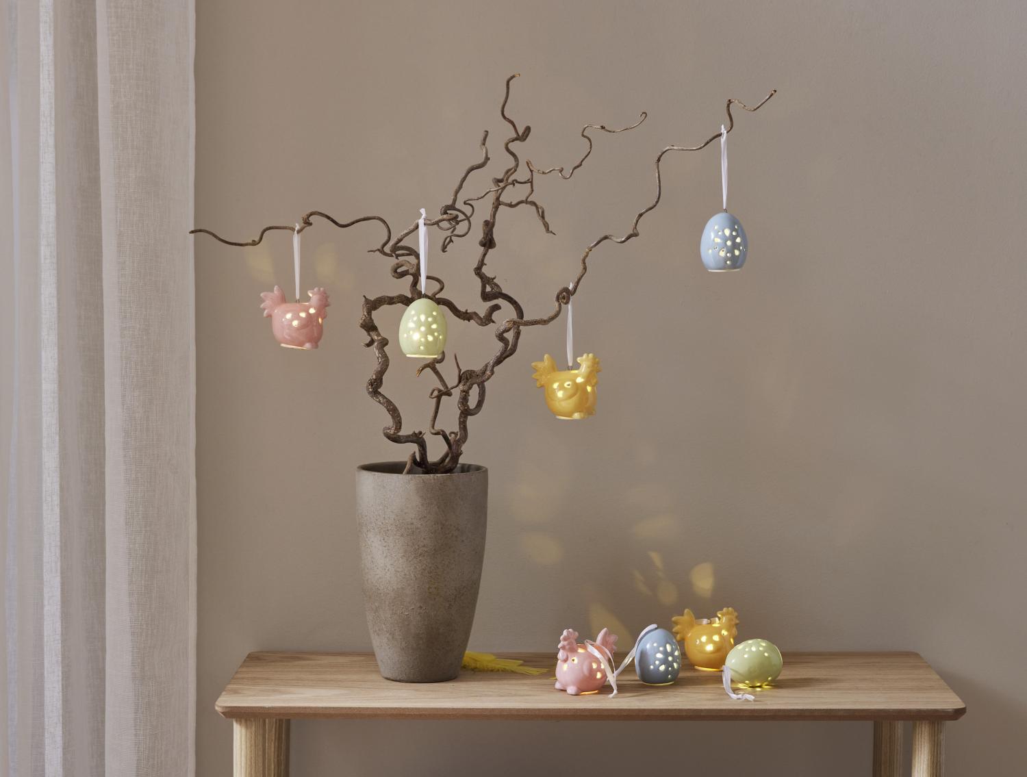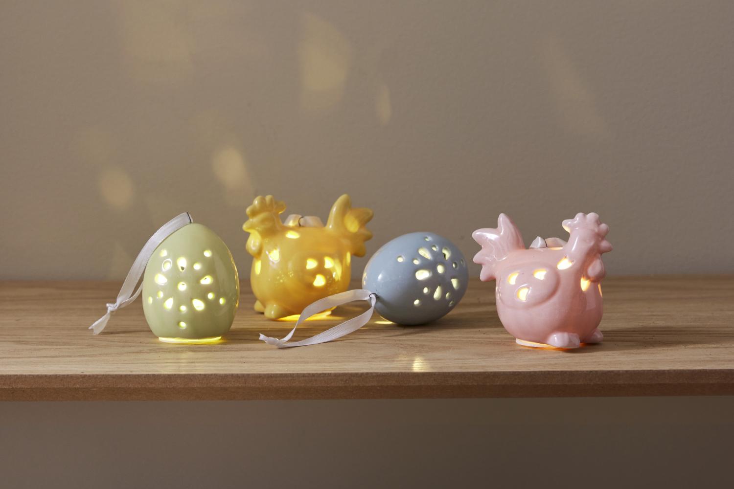 Dekorativ påskdekoration i set av 2 st påskkycklingar och 2 st ägg i blank porslin. Härliga pastelliga färger som lätt kombineras med andra påskdekorationer. Drivs med batteri (köps separat) och lyser i behagligt varmvitt sken. Lika fina tända som släckta.