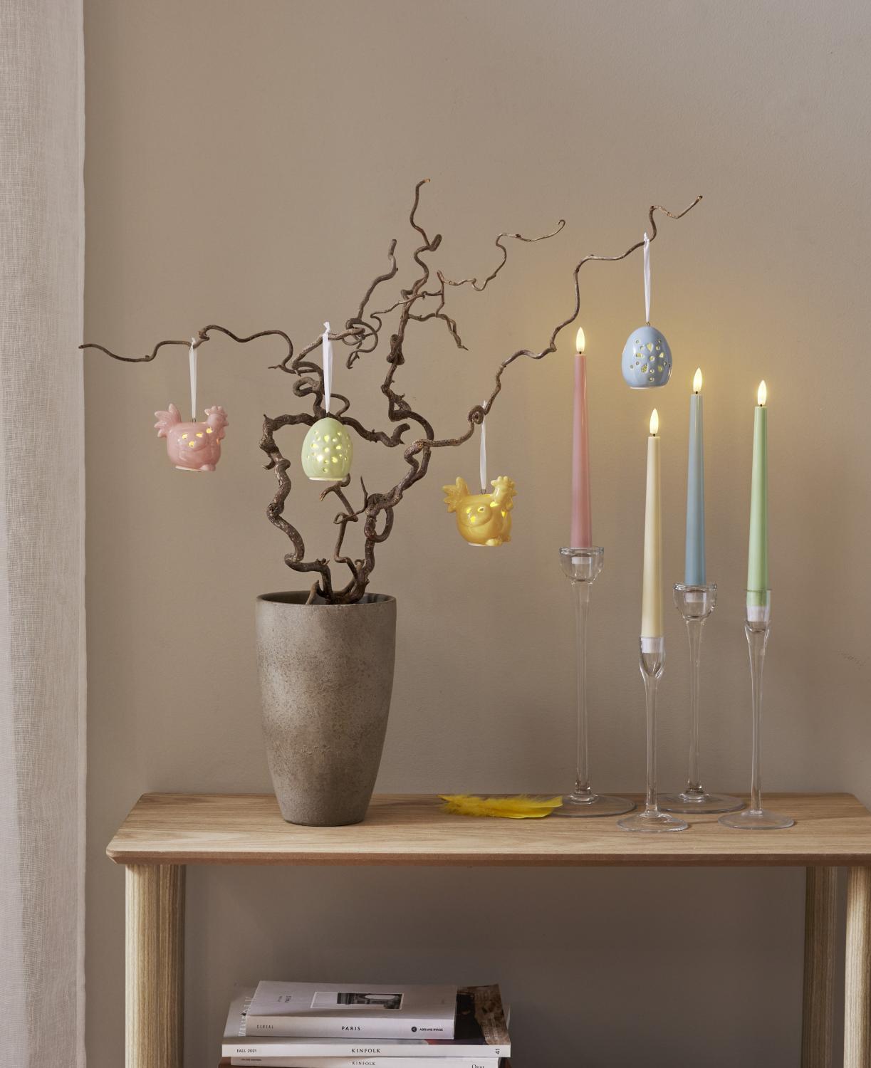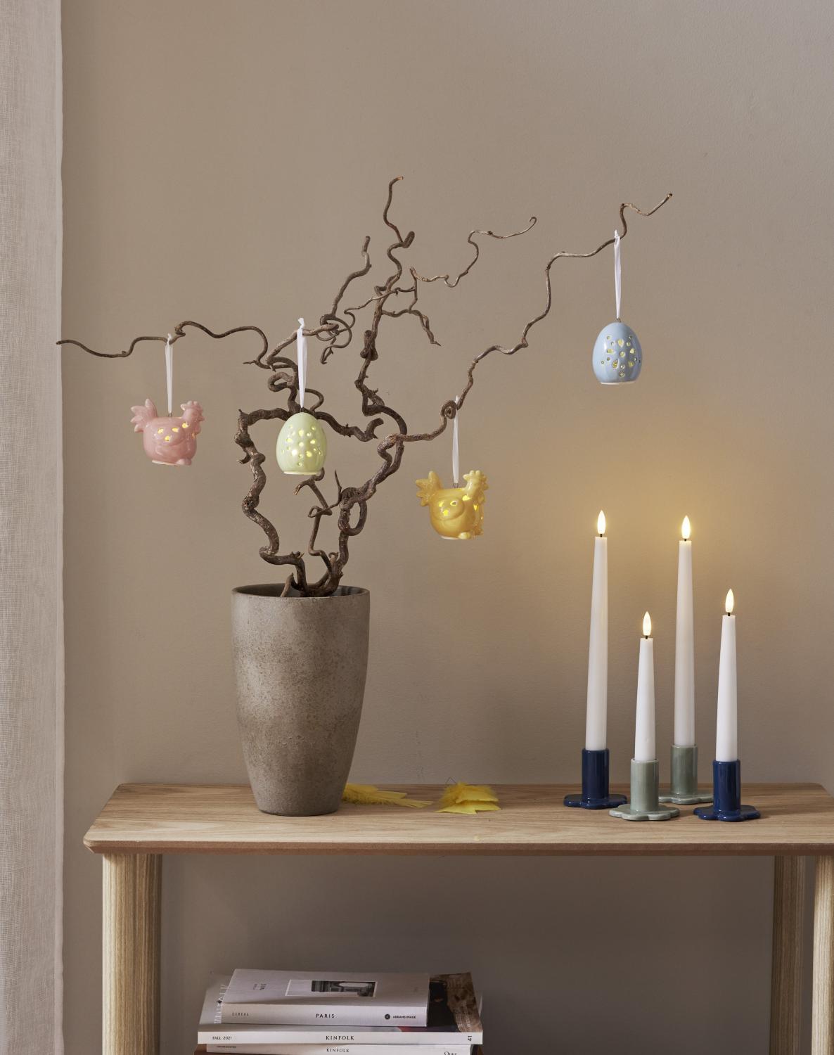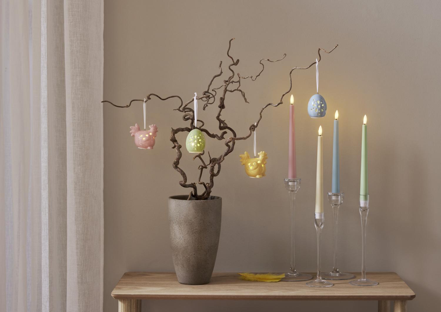 Dekorativ påskdekoration i set av 2 st påskkycklingar och 2 st ägg i blank porslin. Härliga pastelliga färger som lätt kombineras med andra påskdekorationer. Drivs med batteri (köps separat) och lyser i behagligt varmvitt sken. Lika fina tända som släckta.