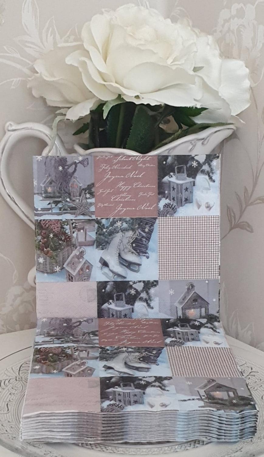 Vackra jul servetter med gammeldags motiv och rosa inslag.. Fina pappersservetter 3-lager. Innehåller 20 st. Vattenbaserade färger, miljövänliga