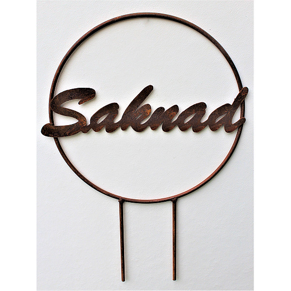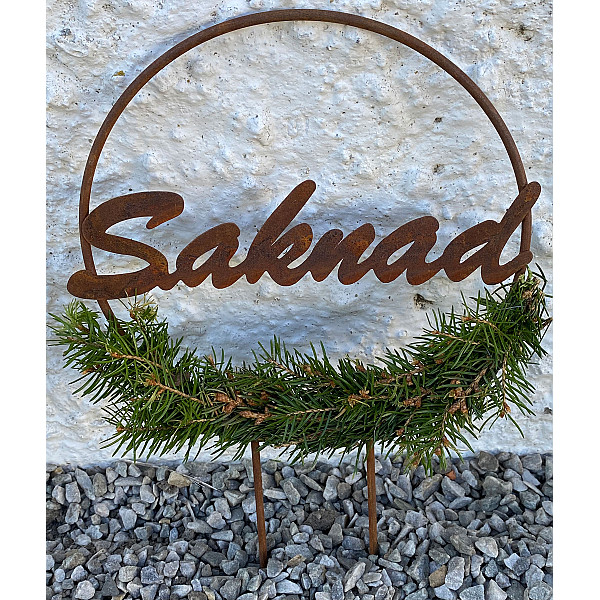 Vacker krans i rostig metall till grav eller minnesplats. Kransen har texten "Saknad". Fin som den är eller dekorera den med t.ex. granris. En fin gravdekoration.