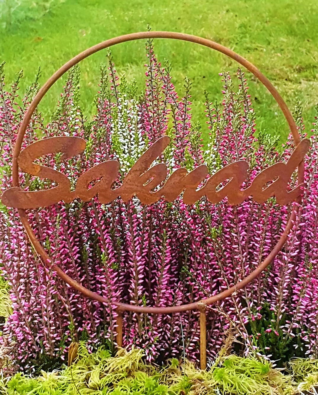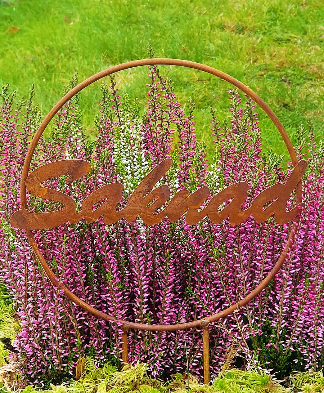 Vacker krans i rostig metall till grav eller minnesplats. Kransen har texten "Saknad".