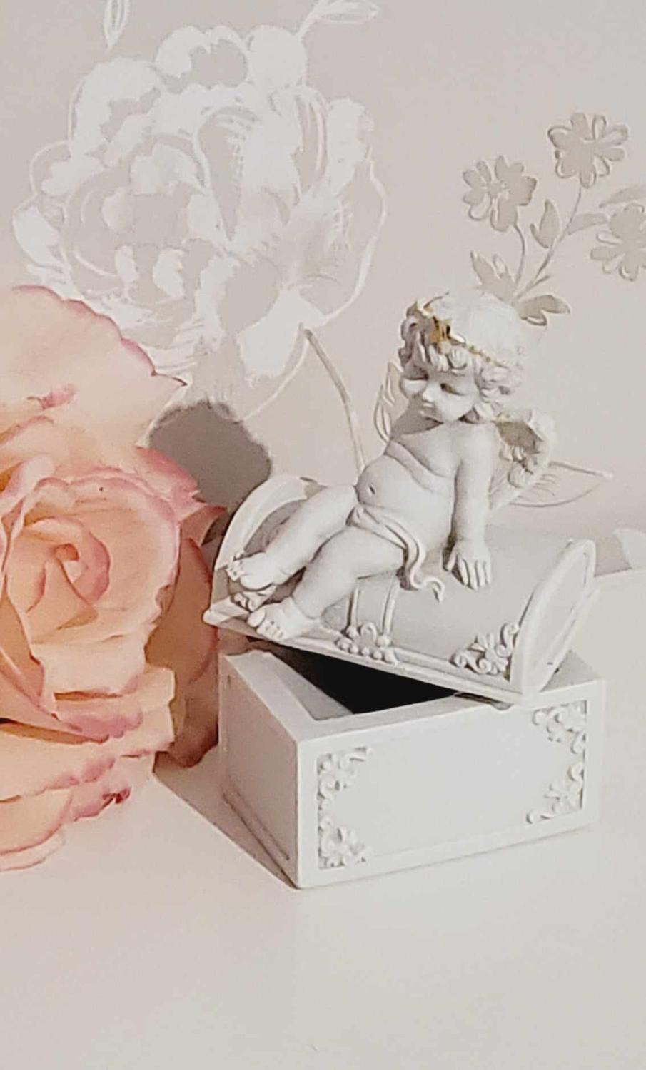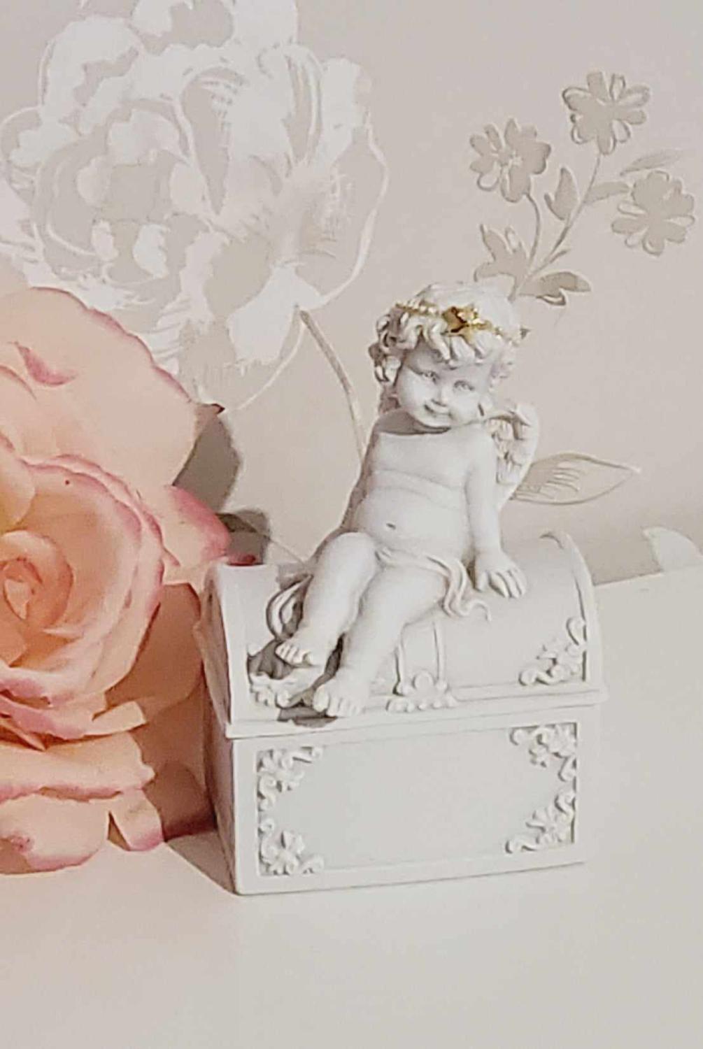 En oerhört söt prydnadsask med en sittande ängel på locket. Harmonisk ask som är detalj full och välarbetad, fin från alla håll.