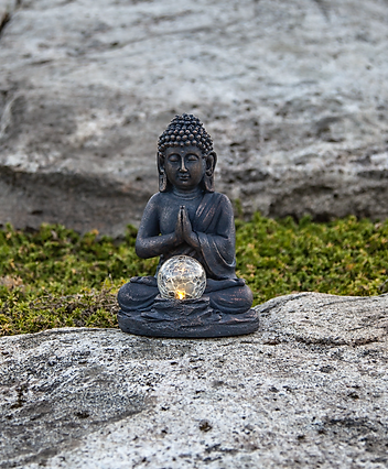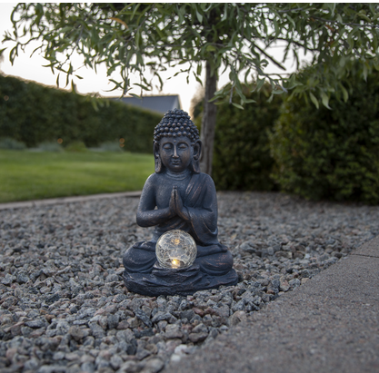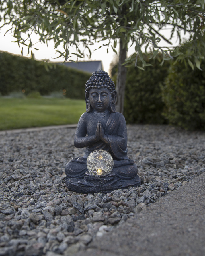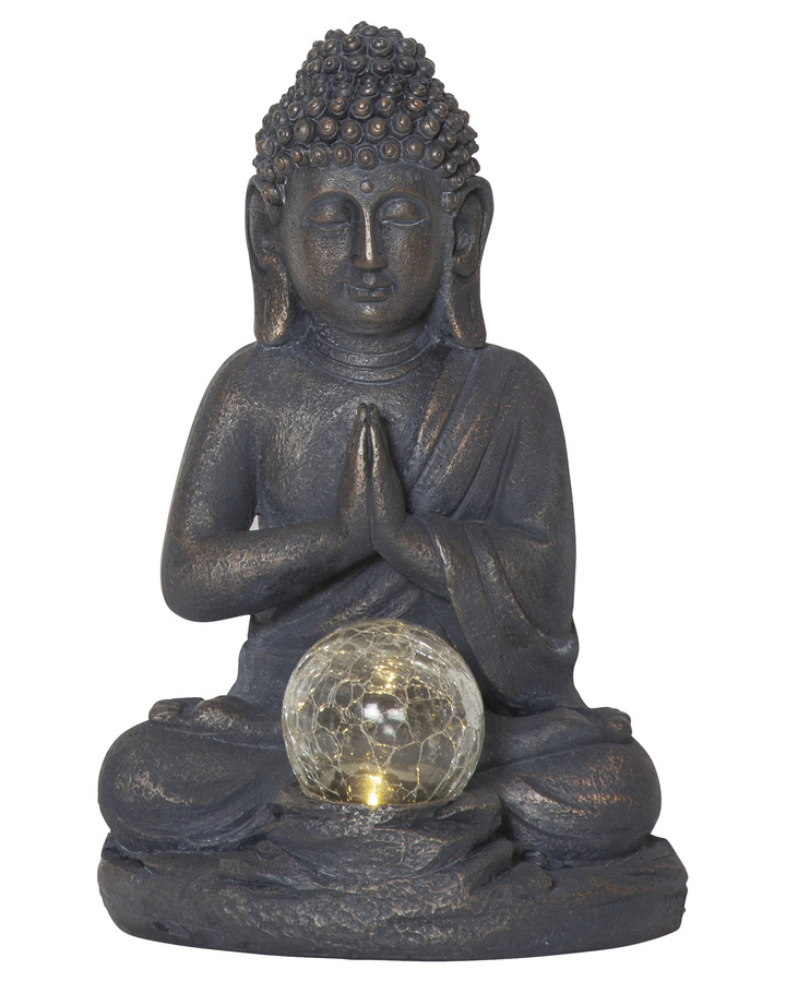 Vacker solcell trädgårdsdekoration i form av en Buddha. Denna dekoration i grå polyresin med en lätt bronsmelerad yta som lyser upp i den klara kula