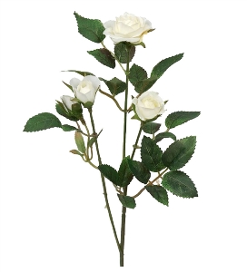 Vacker kvist med vita rosor och gröna blad, ser mycket verklig ut. Perfekt i den låga vasen för bordsdekorationer.
