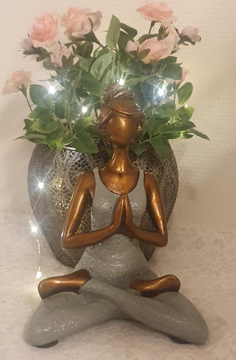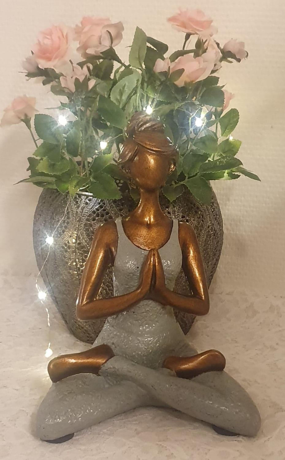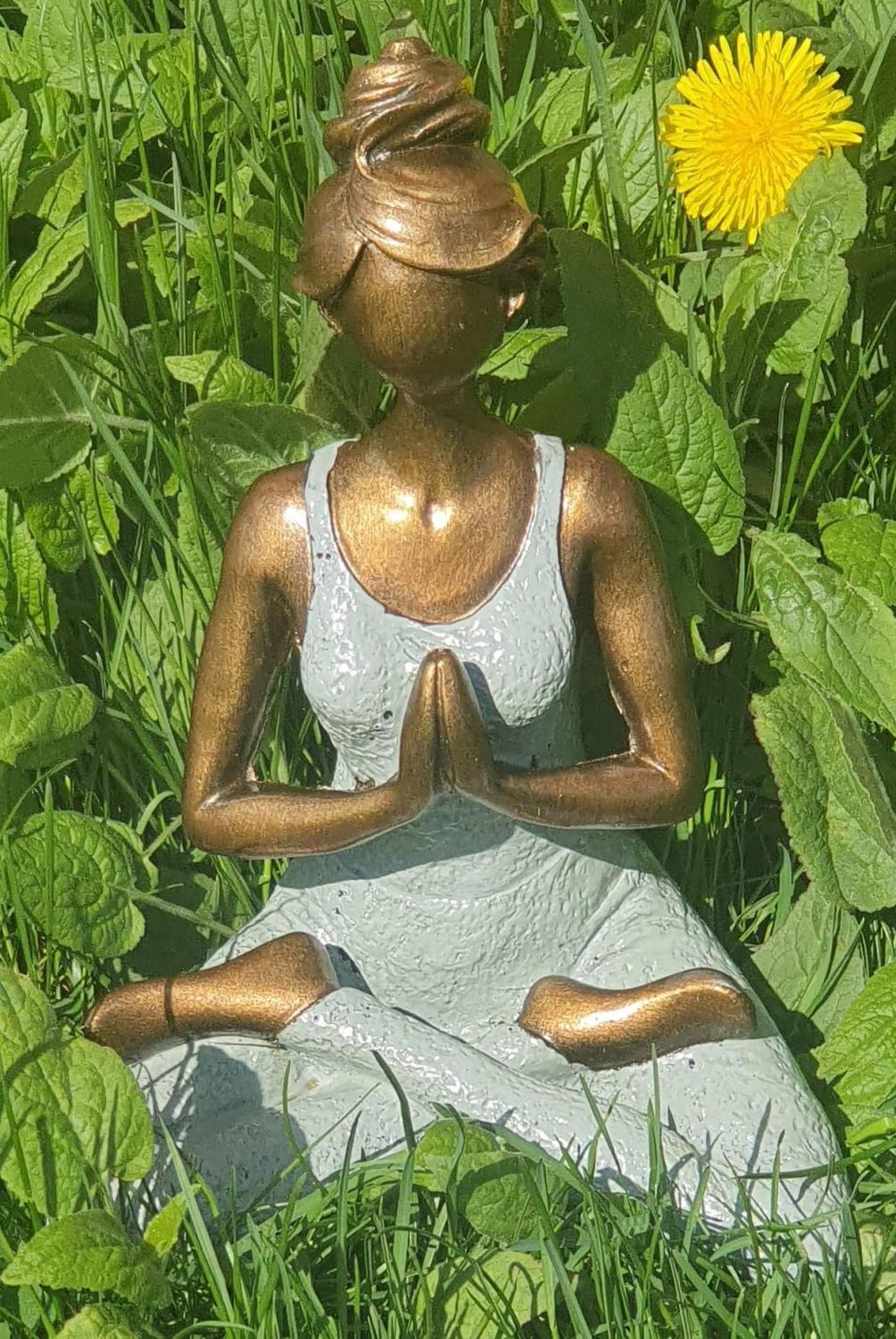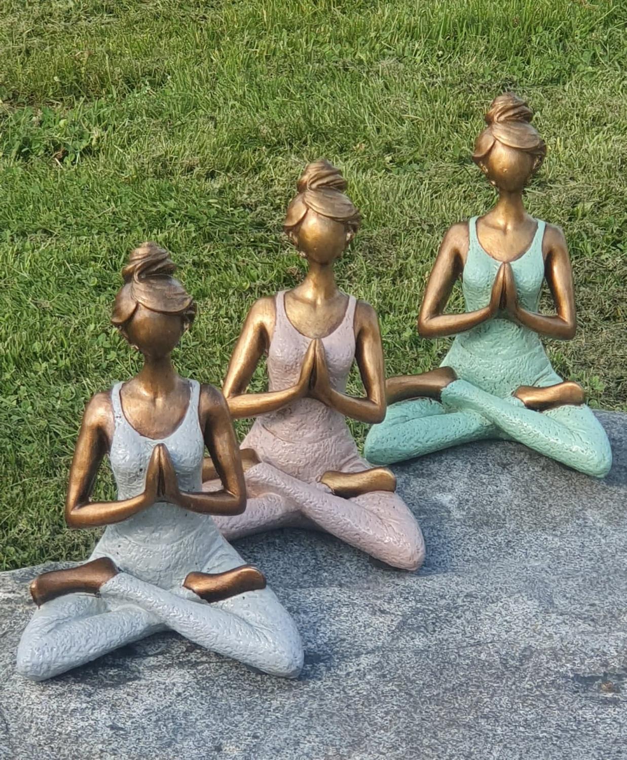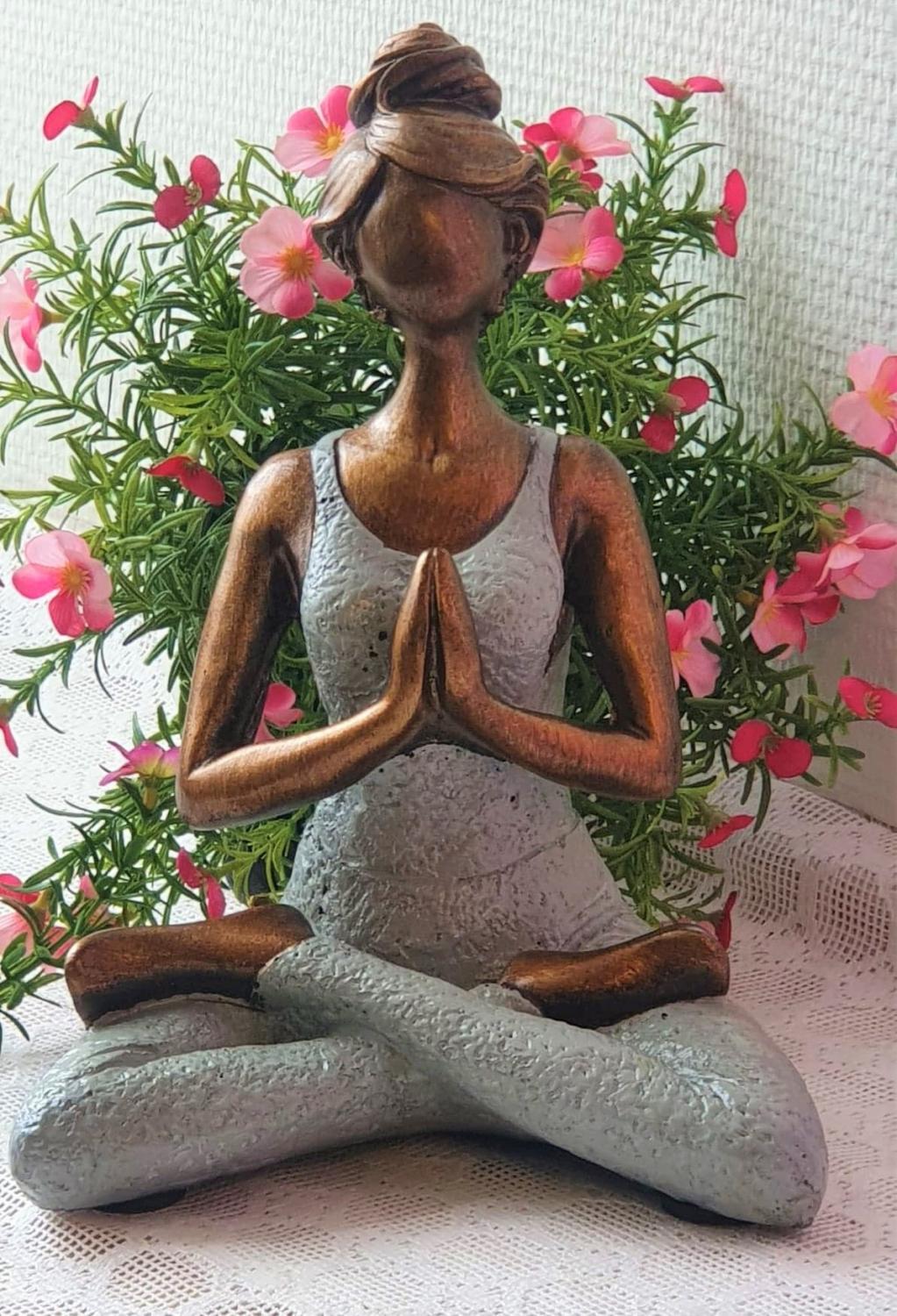 Vacker kvinna i yoga-ställning i gråfärgad dress, tillverkad av hård poly. Den blir en riktig "utstickare" bland hemmets övriga inredning. Handgjorda yoga damer, vilket gör att de inte är helt identiska så varje produkt blir ett unikt exemplar. Det kan förekomma mindre variationer på storlekar, mönster och färger.
