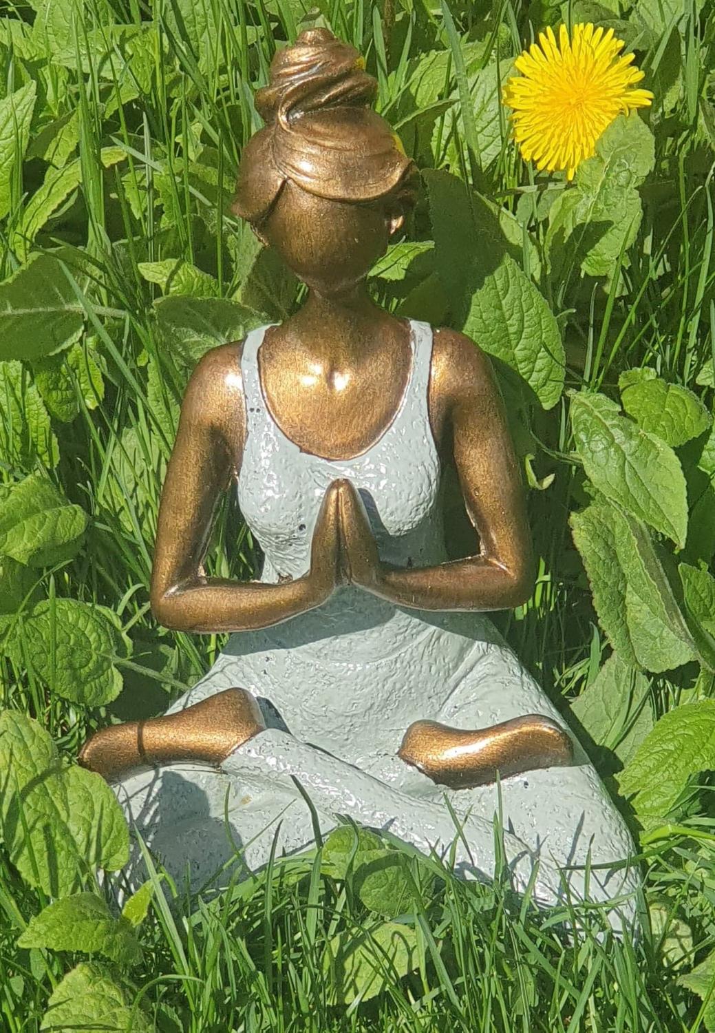 Vacker kvinna i yoga-ställning i gråfärgad dress, tillverkad av hård poly. Den blir en riktig "utstickare" bland hemmets övriga inredning.