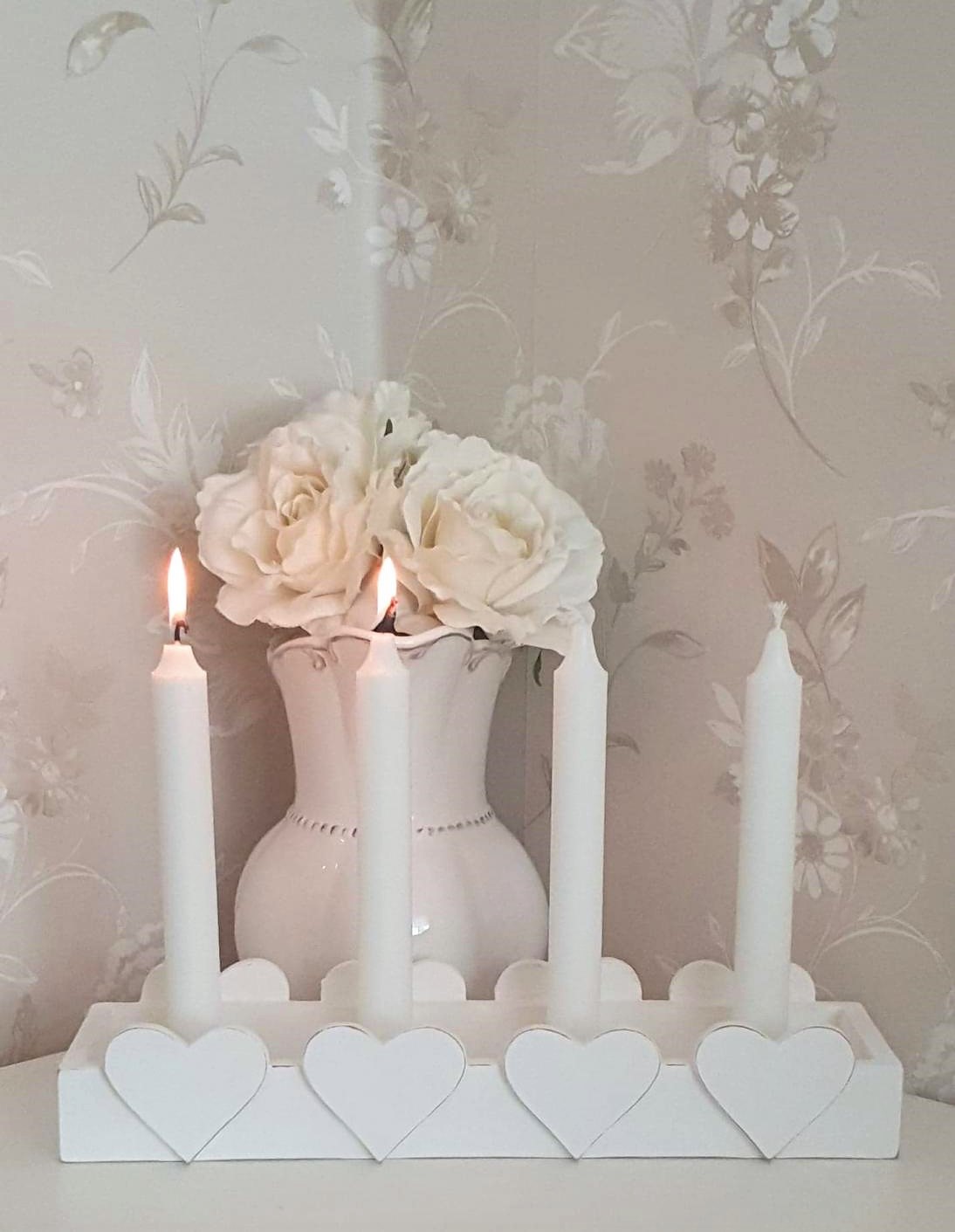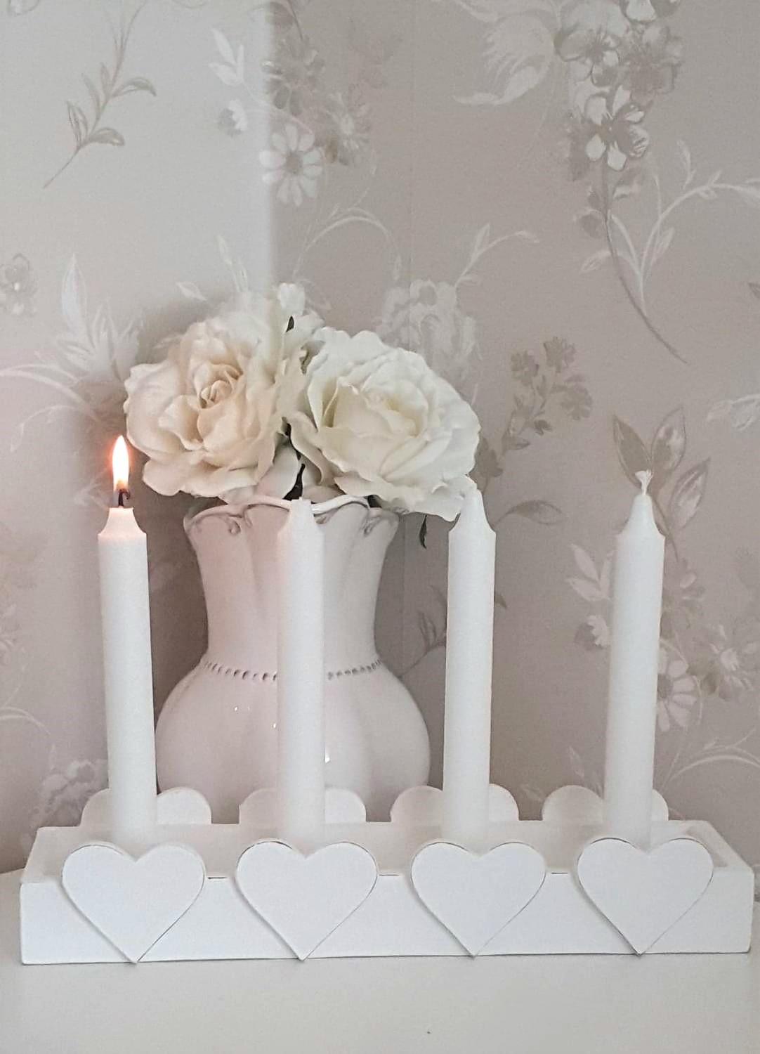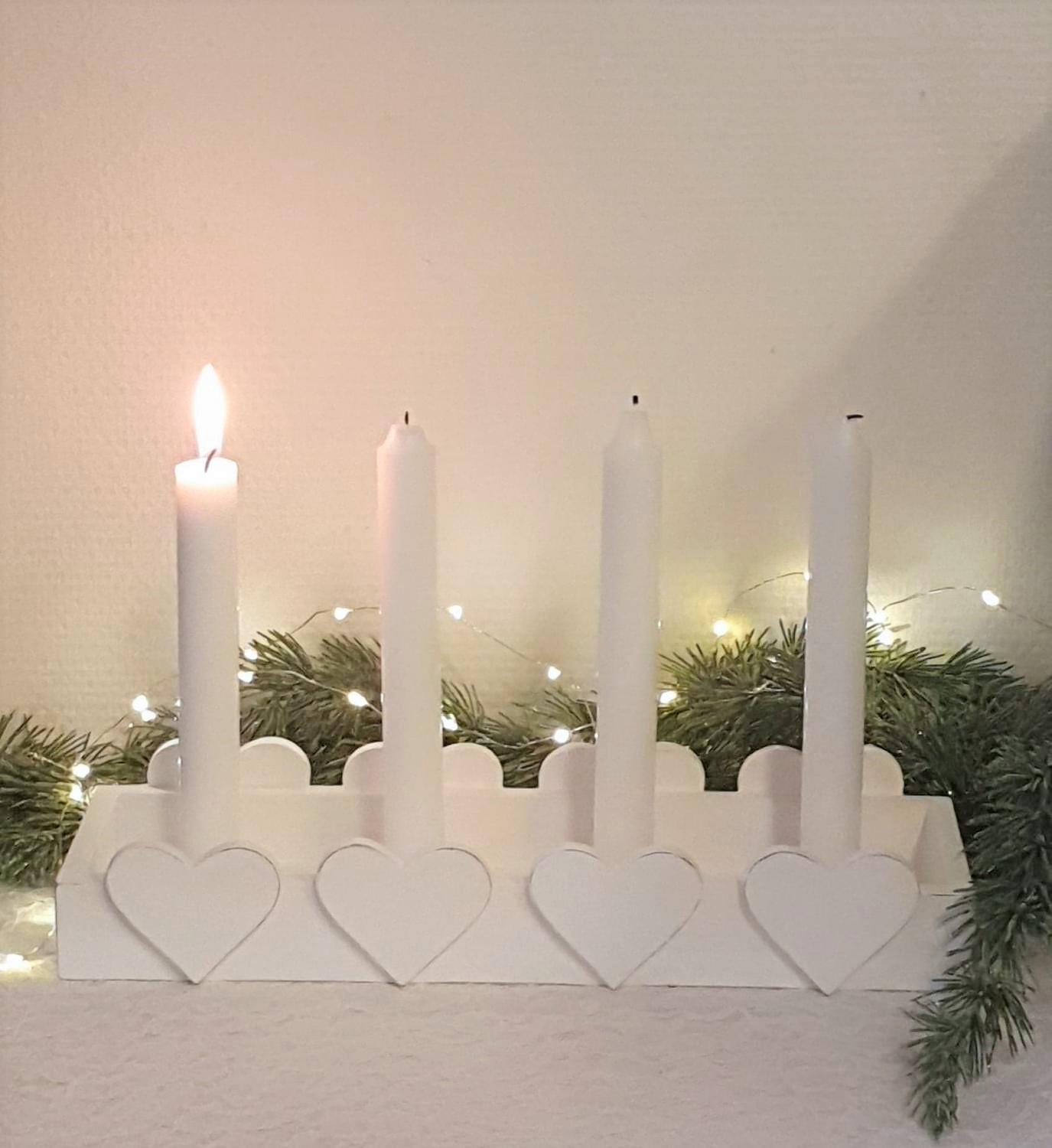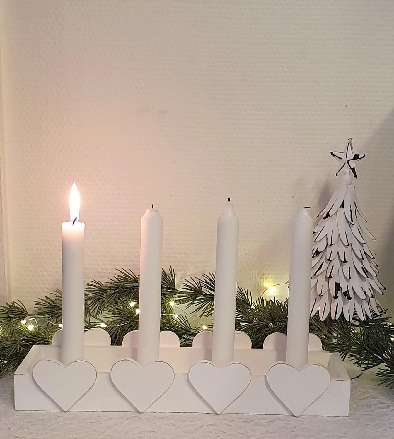 Vacker adventsljusstake med hjärtan i vit målad trä. Otroligt fin ljusstake med fyra ljushållare. Fin att smycka på olika sätt och ett riktigt blickfång på bordet.