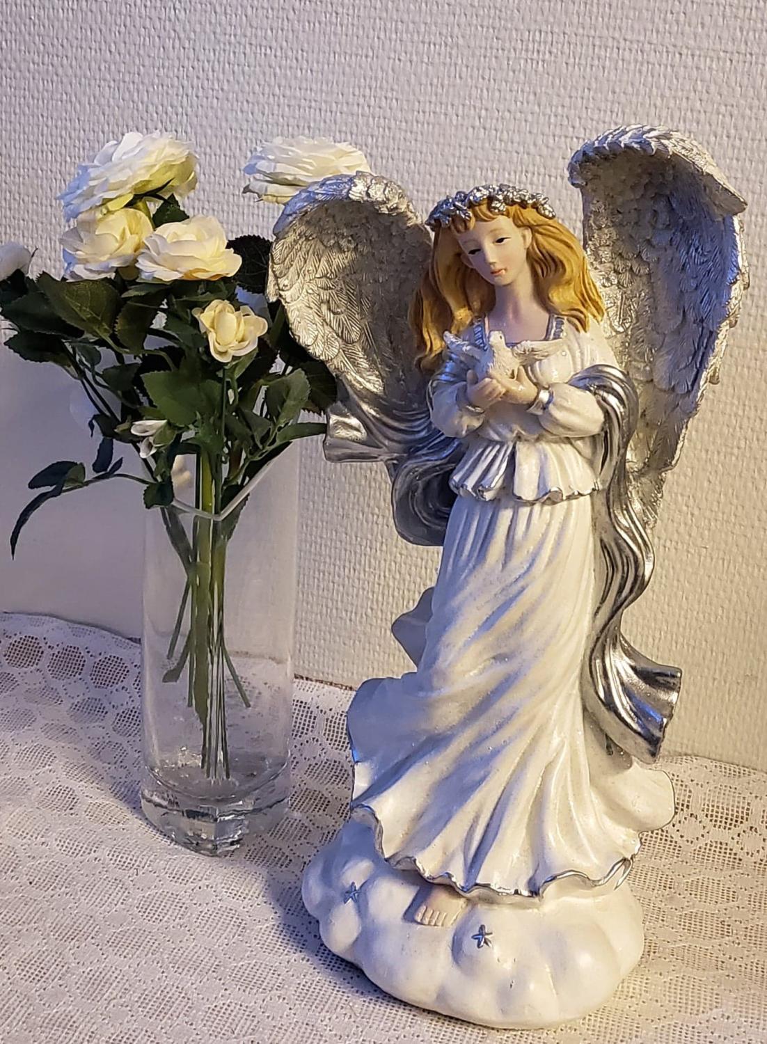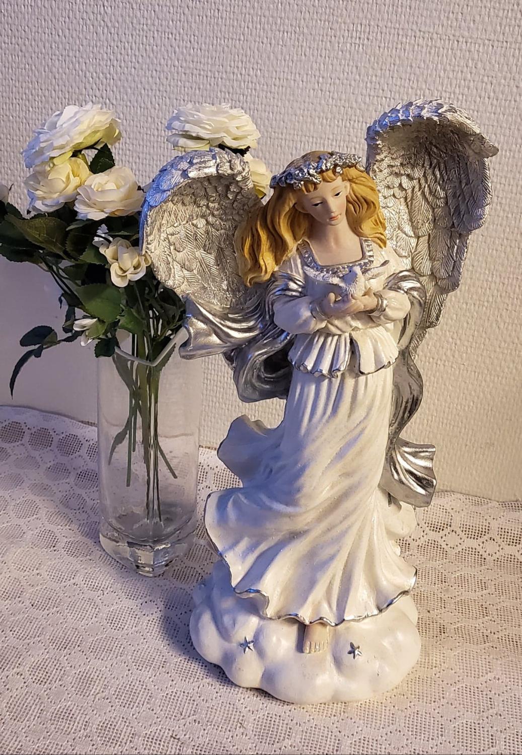 Vacker välgjord ängel som håller en fågel. Denna ängel kan man placera i vilket rum som helst då den blir en mycket vacker inredningsdetalj.