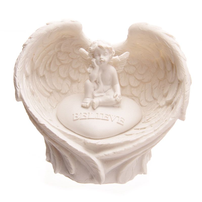 Vacker ängel sittande i änglavingar med blå ledbelysning och texten "BELIEVE", väldigt fin prydnad. Ängeln är tillverkad av polyresin.