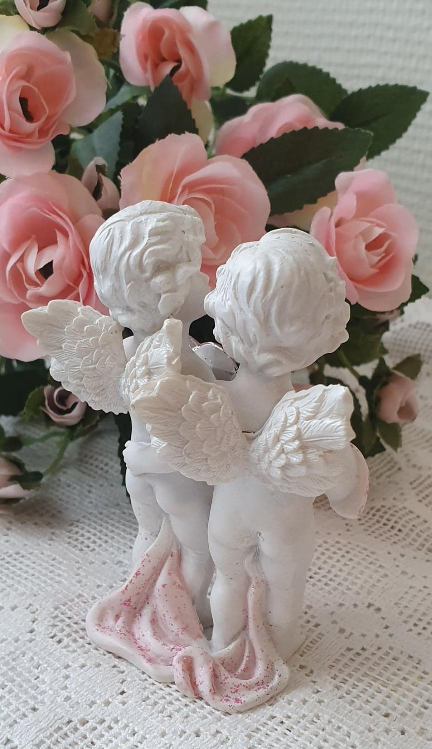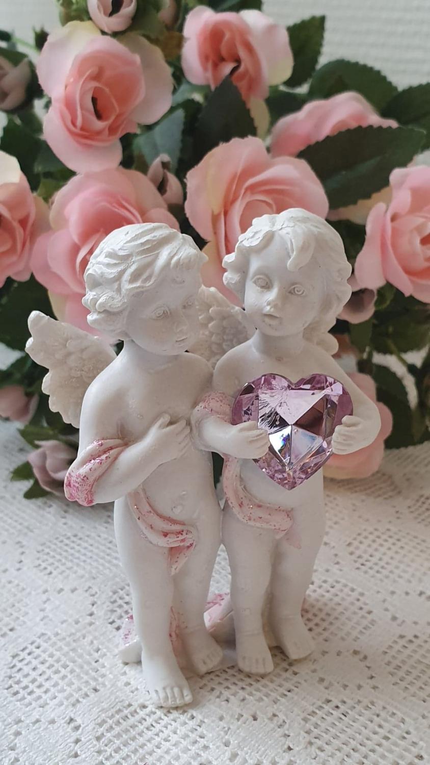 Två söta änglar med ett fint akrylkristall hjärta i handen och ett fint glittrande tyg över sig. De är tillverkade av polyresin och handmålade.