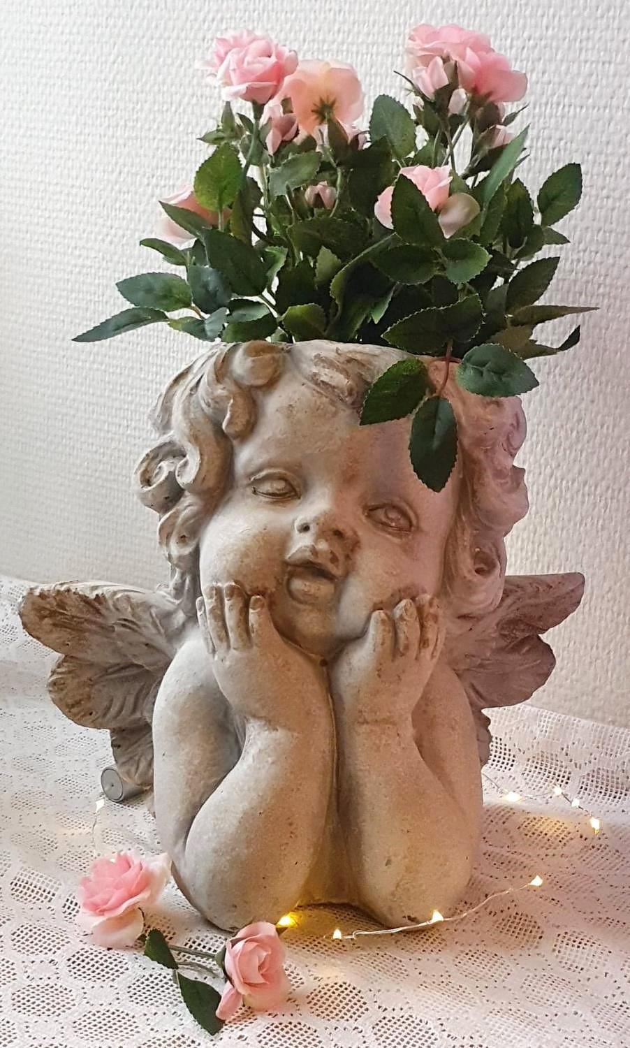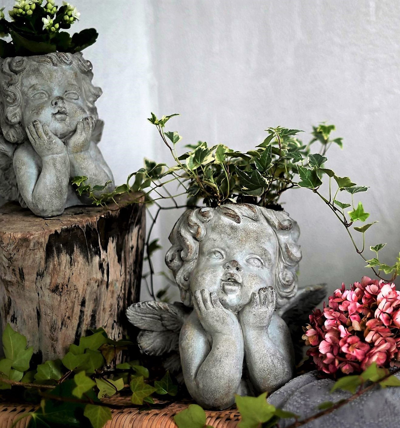 Vacker ängel kruka producerad i gammal stil. Den är designad som ett huvud med välgjorda detaljer. Krukan blir en vacker dekoration till hemmet oavsett om den används som kruka eller som ensam skulptur. Ställ den på en fönsterbräda eller ett avlastningsbord. Trevlig kruka som gör sig extra bra med en yvig växt i.