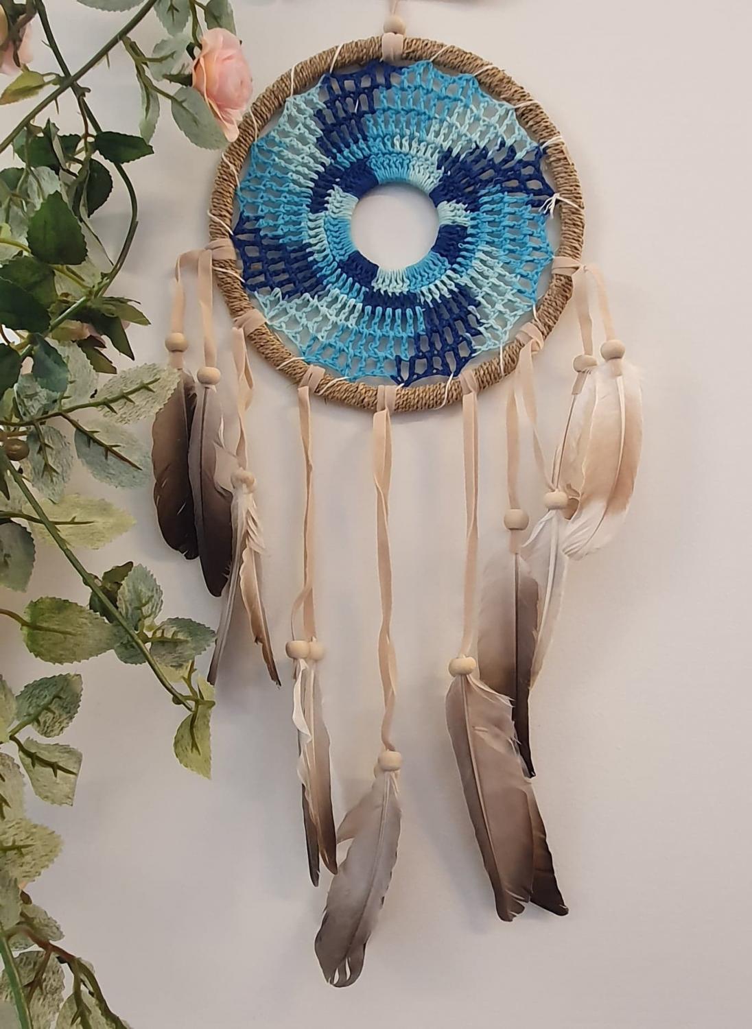 En fin virkad drömfångare med fina detaljer som du kan hänga ovanför din säng för att skydda dig ifrån onda drömmar. Drömmfångarens ring har en diameter på 16 cm.