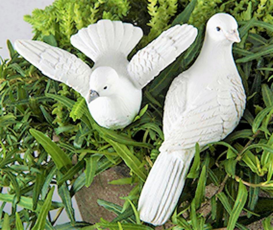 Söta duvor som sitter på en pinne i polyresin. Fin dekoration till graven, blomkrukan eller blombuketten.