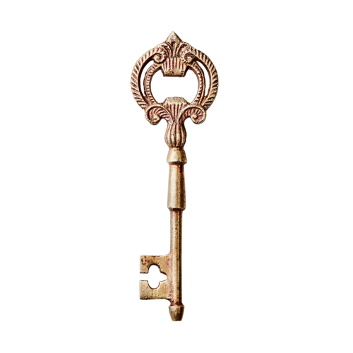 Kapsylöppnare i mässingsfärgad metall, lika fin som inredningsdetalj som praktisk att öppna flaskor med.