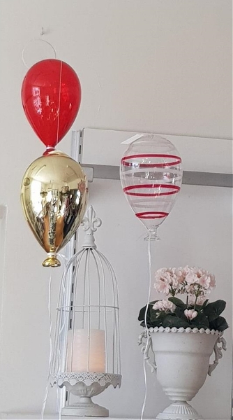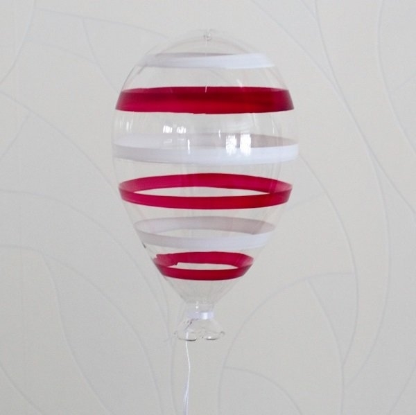 Söta ballonger tillverkade i lätt glas i olika färger. Fint att dekorera med i barnrummet eller vid vilket festligt tillfälle som helst, flera tillsammans eller en ensam lika vackra vilket som. Ballongen kommer med genomskinlig tråd som den hängs upp i och ett smalt sidenband för dekoration.