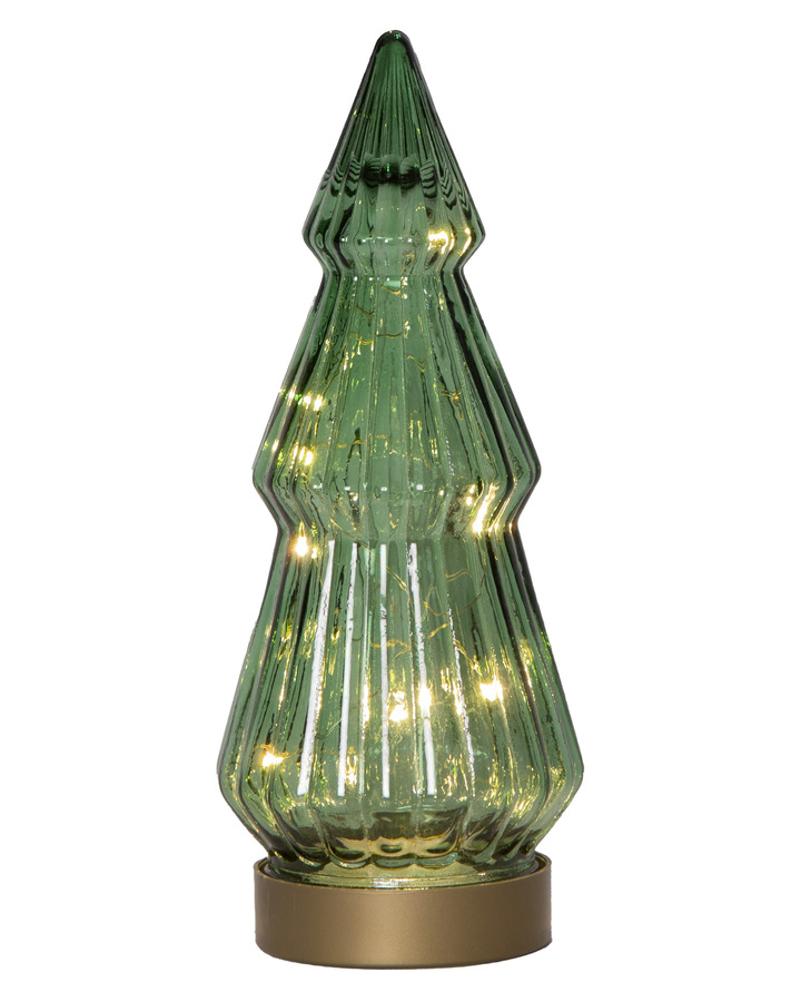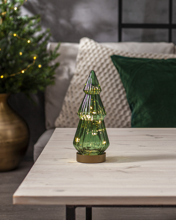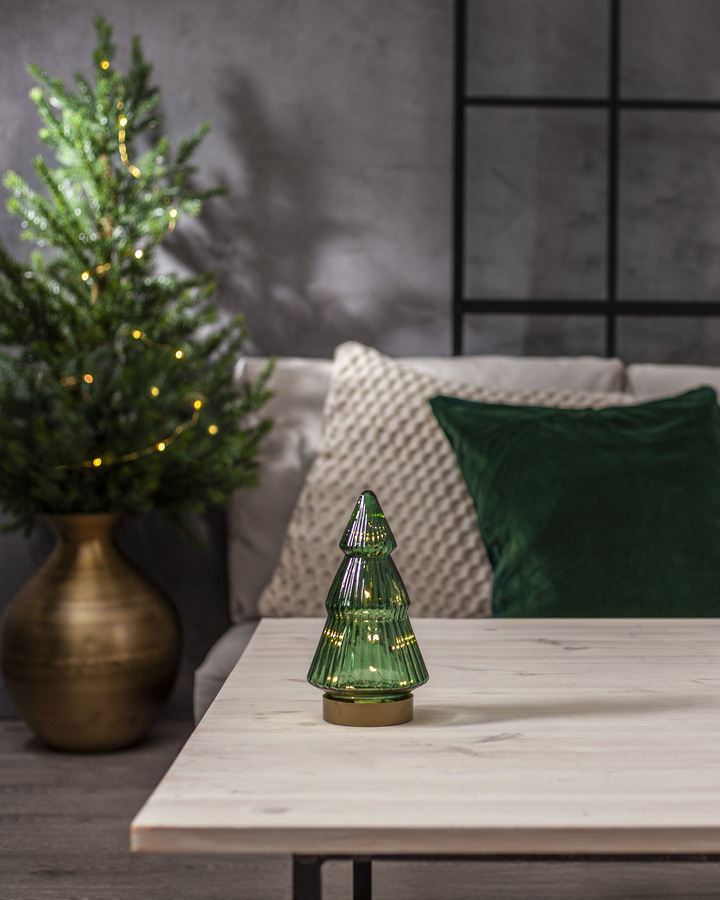 Elegant bordsdekoration i form av en gran, tillverkad i transparent mörkgrönt glas med en guldfärgad bas som diskret döljer batteriboxen. Den drivs av 2 AAA-batterier och sprider ett vackert sken – perfekt som stämningsfull detalj på julbordet, fönsterbrädan eller i en hylla.