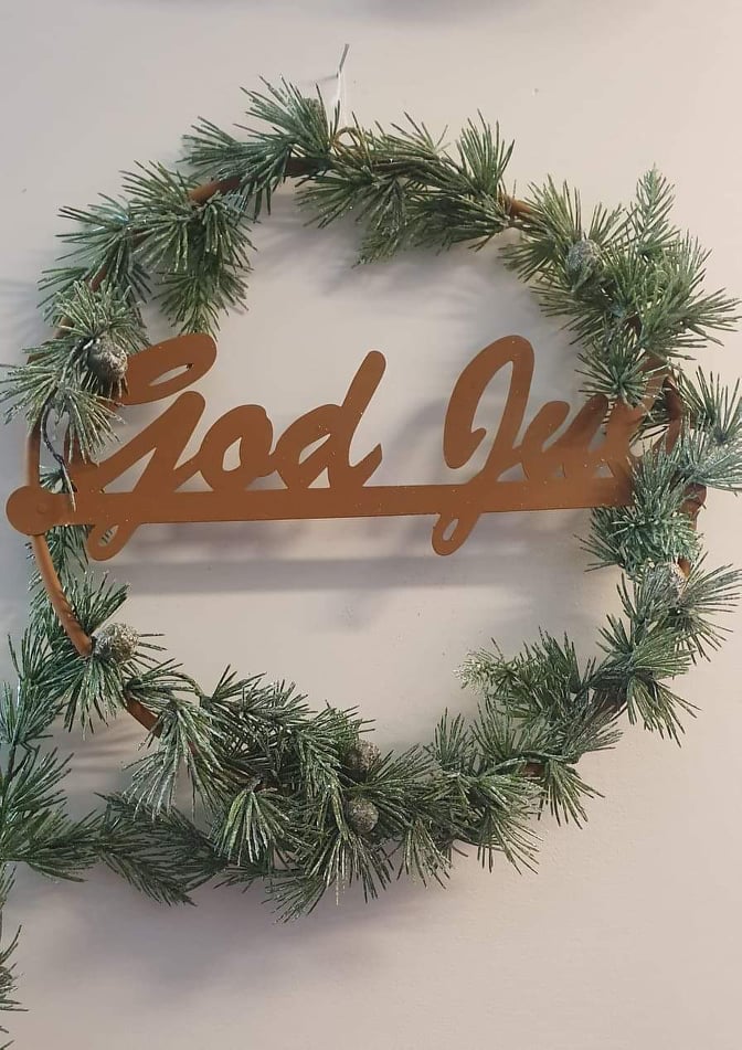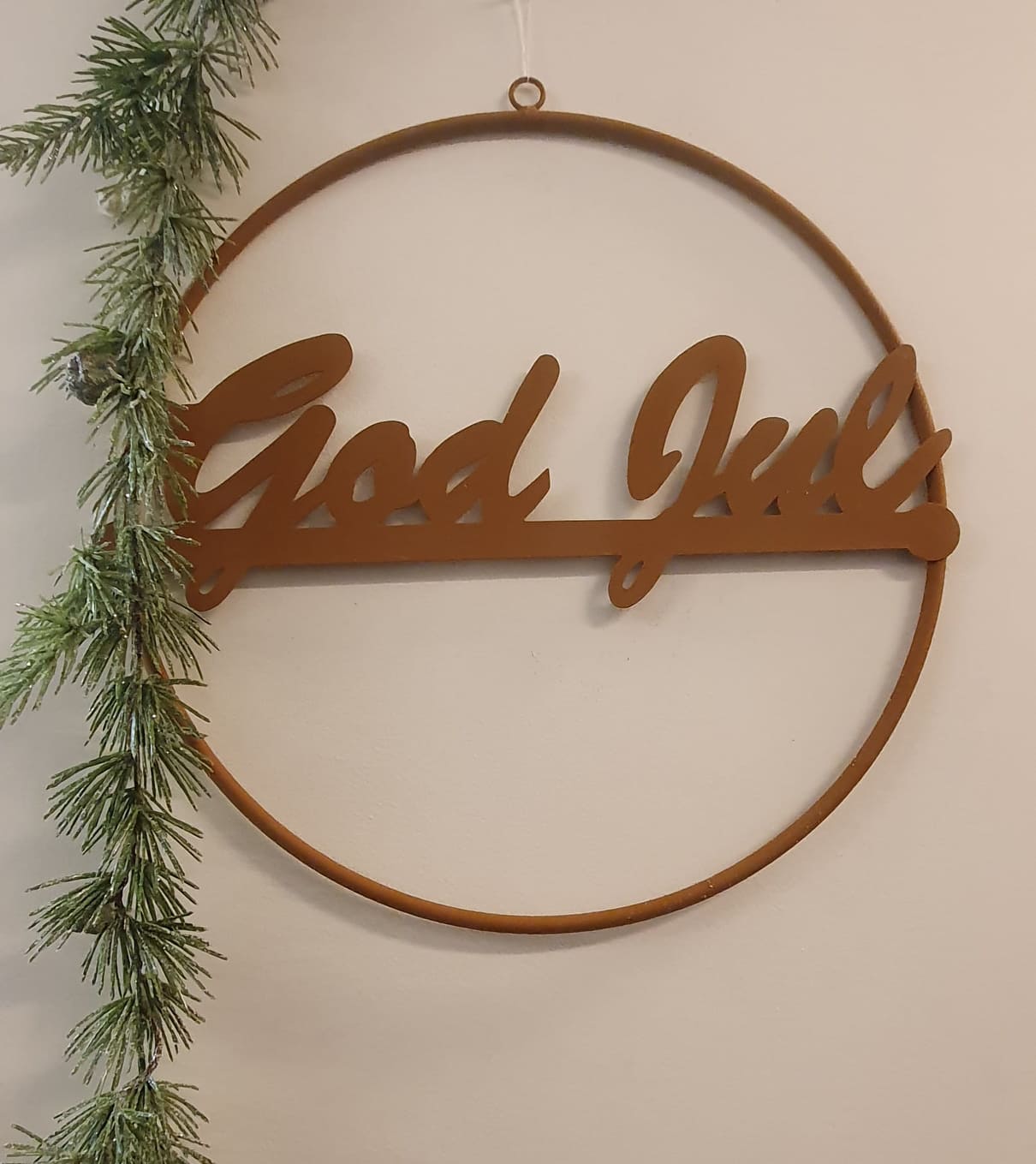 En fin julgrans i metall med utstansad text "GOD JUL". Målad i verklighetstroget rostliknande färg. Fin som den är eller dekorera den med t.ex. granris och kottar. Litet hål upptill för upphängning.