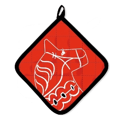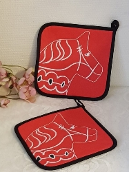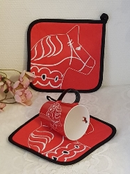 En fin röd grytlapp med motiv av dalahäst.;Mått:- 20x20cm100 % bomull, tvätt 40*