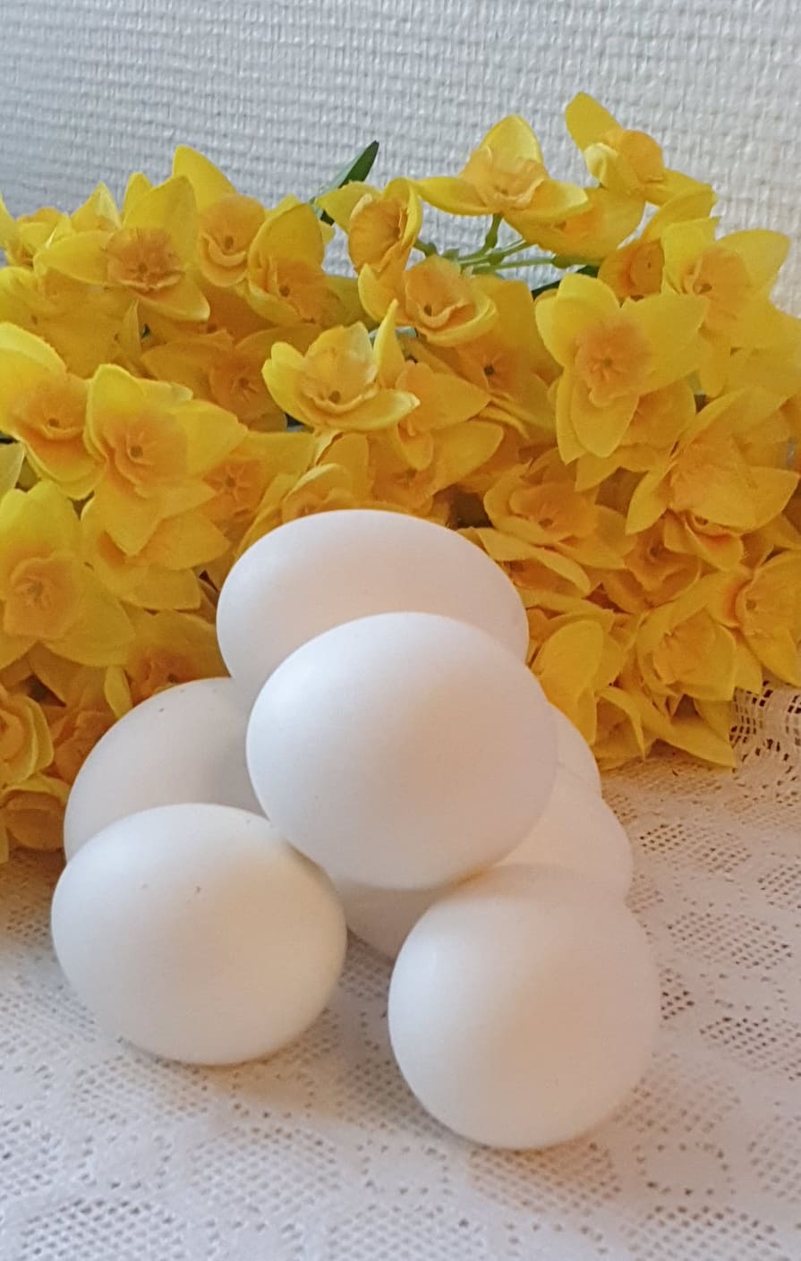Dags att pynta in Påsken. Naturliga urblåsta hönsägg i vita färger, fina som dekoration på bordet, bänken, i blomkrukan, kransen, på ljusbrickan.