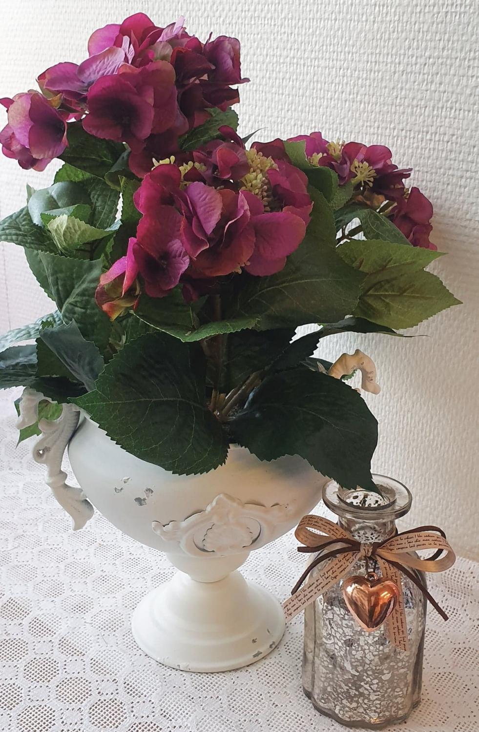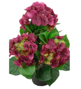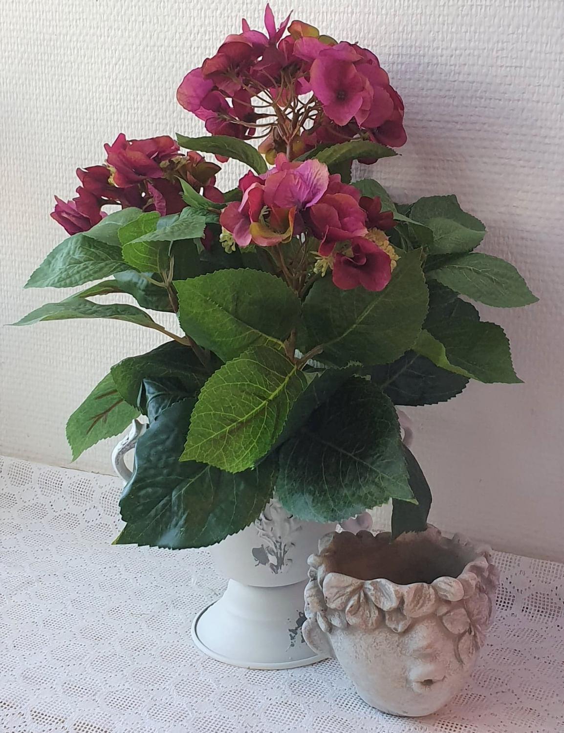 Vacker konstgjord naturtrogen lila hortensia planterad i en svartinnerkruka som håller sig frisk och vacker år ut och år in.