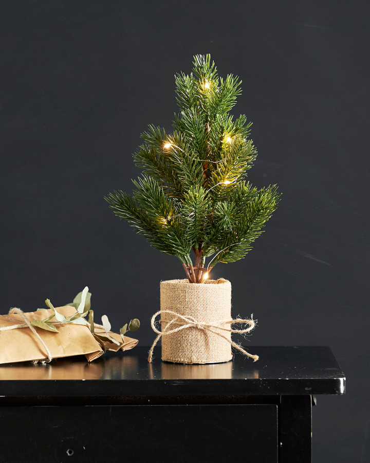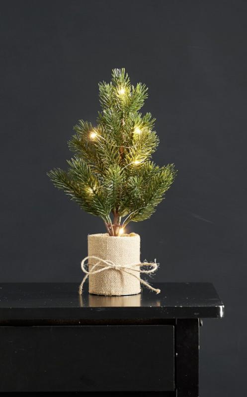 Jättesöt batteridriven bordsgran med 8 varmvita led-ljuskällor och timerfunktion. Basen är klädd i jute som ger bordsgranen dess dekorativa och naturtrogna uttryck. Lika fin att dekorera med i barnrummen som husbilen eller i fönstret tack vare dess nätta storlek samt att den inte behöver pluggas in i vägguttag. Sprid julstämning där du vill med denna söta bordsgran!