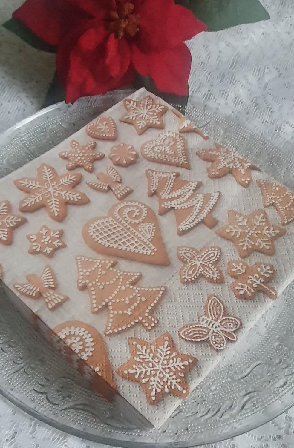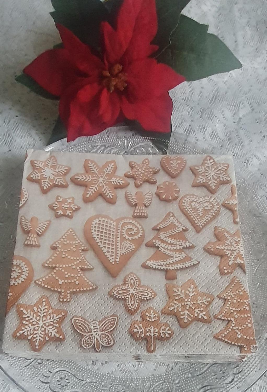 Vackra servetter med ett juligt motiv av pepparkakor. Fina pappersservetter och julservetter. 3-lager. Innehåller 20 st. Vattenbaserade färger, miljövänliga, blekta utan klorin.