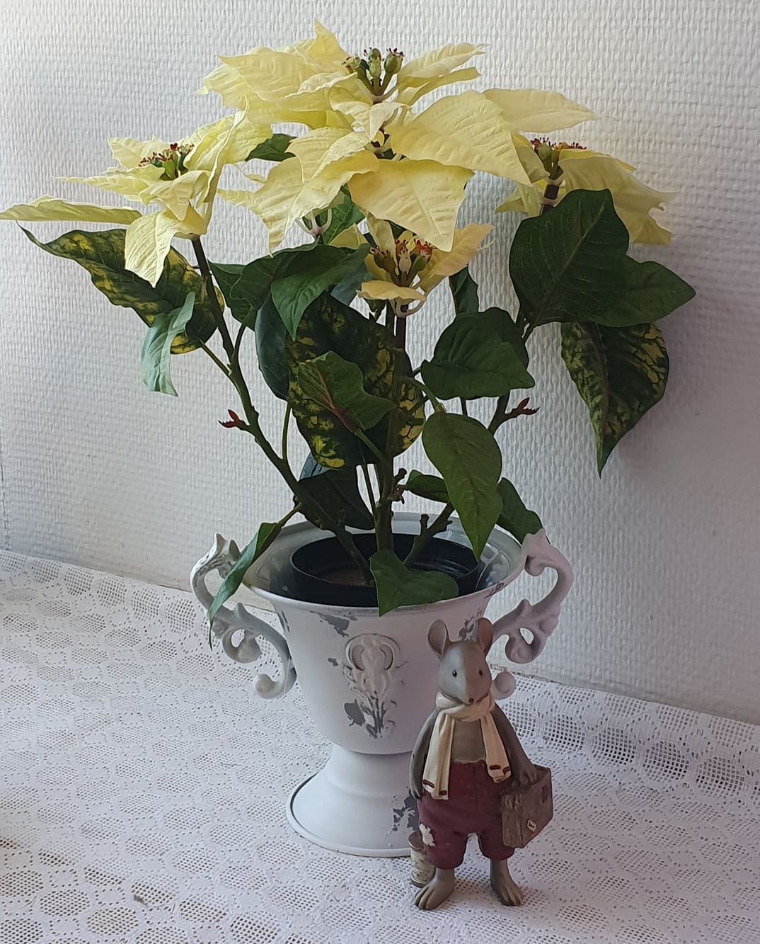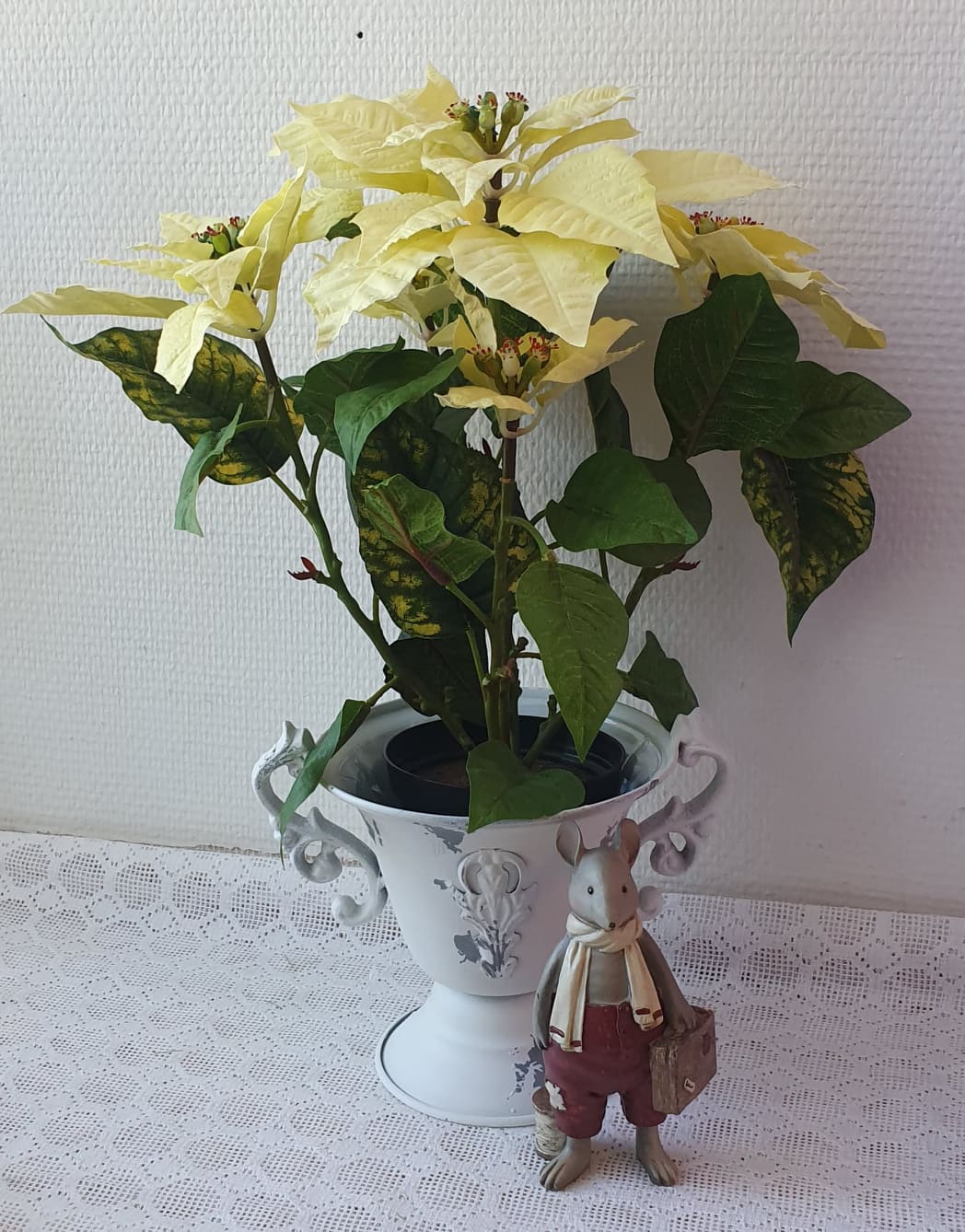 Jättefin gul julstjärna, ser så naturlig ut. Konstgjord julblomma som passar bra både i fönstret och på bordet som en fin juldekoration. Perfekt för alla oss som är allergiska.