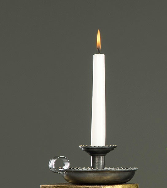 Handgjord kammarljusstake i antikgrå metall med söt dekoration på kanten.