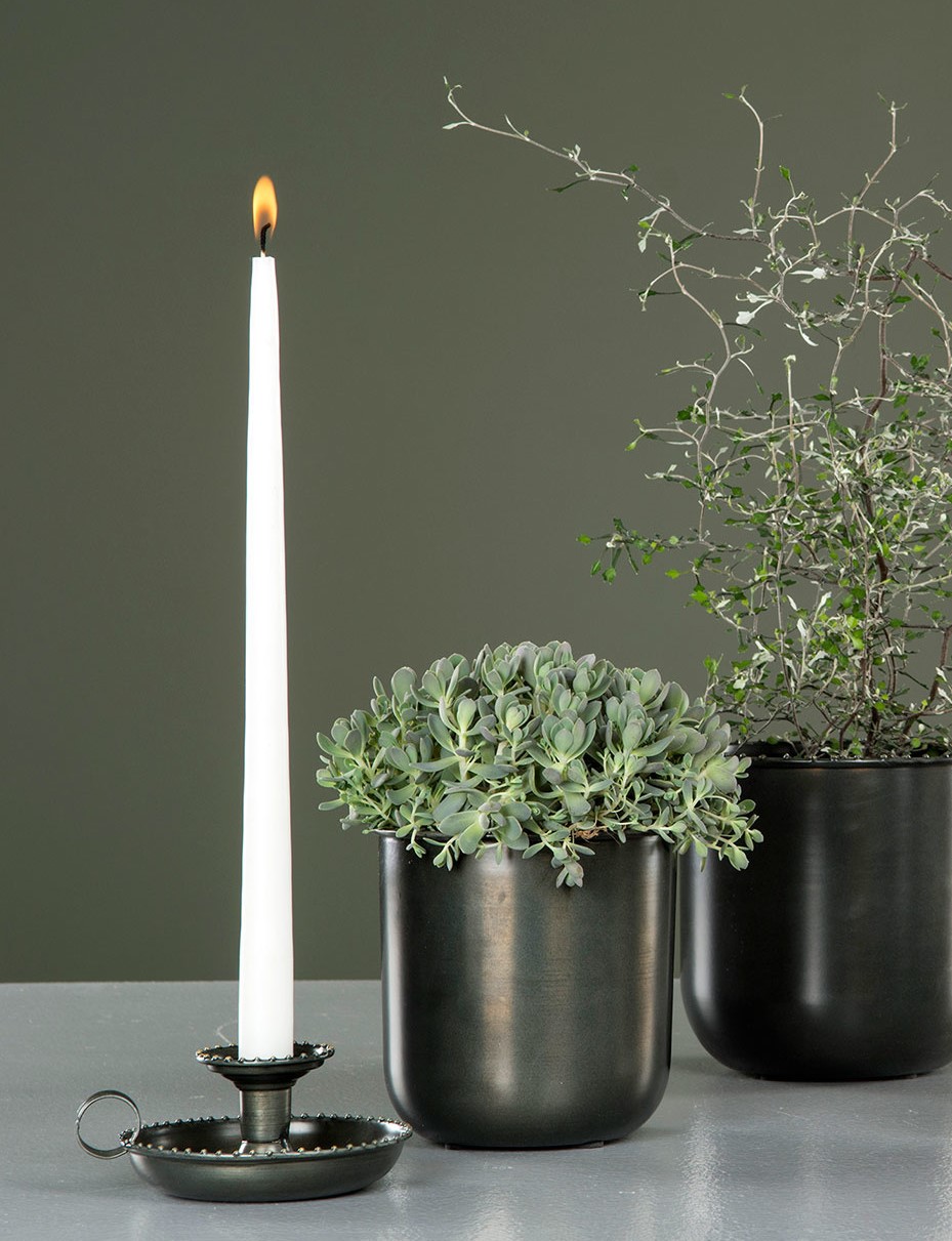 Handgjord kammarljusstake i antikgrå metall med söt dekoration på kanten. Ljusstaken blir en otroligt vacker detalj i hemmet eller sommarstugan som med sin klassiska stil skapar en lantlig stil och stämning.