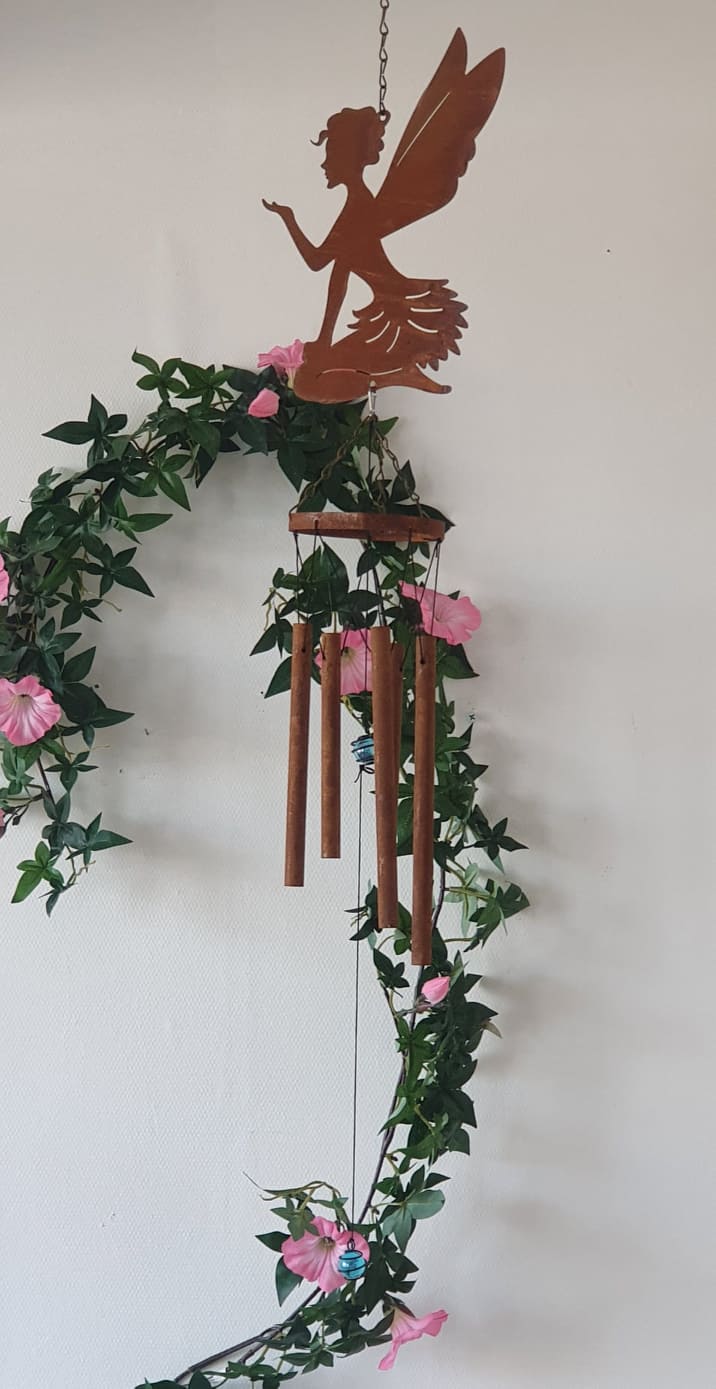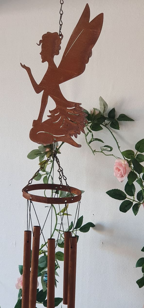 Stor vacker älva i rost med klangvindspel och två blå glaskulor som ger ett fint ljud. Älvan hängs upp i en kedja med tillhörande krok.