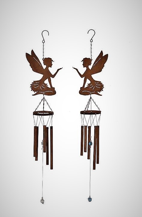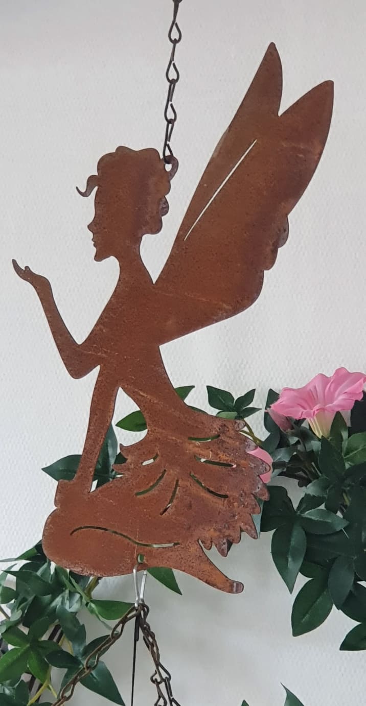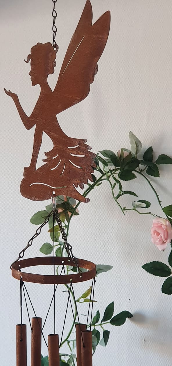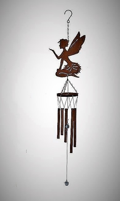 Stor vacker älva i rost med klangvindspel och två blå glaskulor som ger ett fint ljud. Älvan hängs upp i en kedja med tillhörande krok. Älvan är ca 22 cm hög och 18 cm bred. Totalhöjd med kedja och glaskulor ca 83 cm.