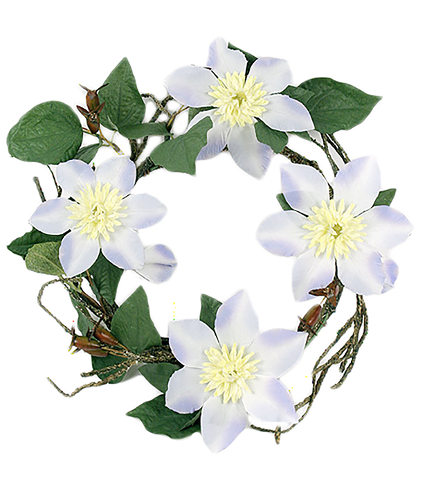 En välkomnande krans på dörren gör både dig och dina gäster glada. Vacker konstgjord clematiskrans med clematisblommor i vitt med inslag av blått på en stomme av tjocka kvistar i konstmaterial, i god kvalitet som håller sig frisk och vacker år ut och år in. Våra konstväxter har väldigt naturtroget utseende. Ett smidigt sätt att njuta av naturens skönhet utan att ha en äkta, levande planta.