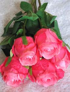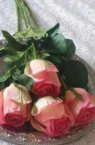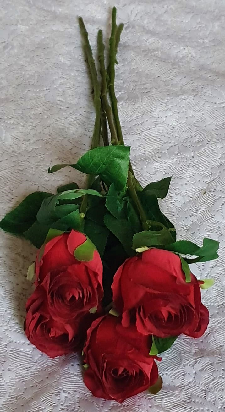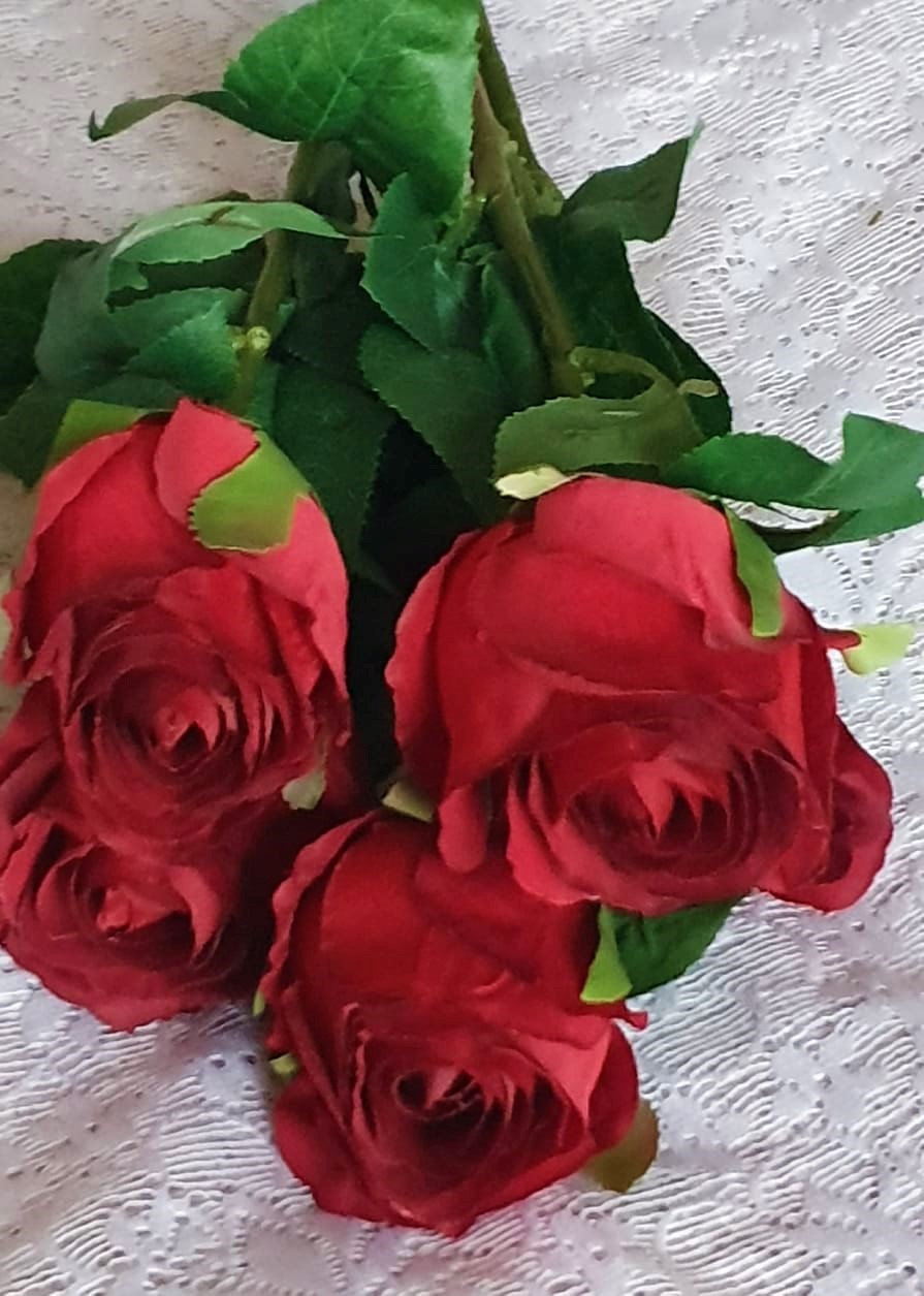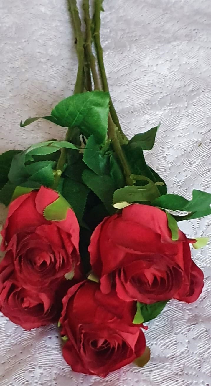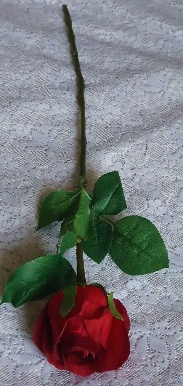 Väldigt vacker och välgjord mörkröd ros på stjälk med fina naturtrogna gröna blad som håller sig fräsch och vacker år efter år. Perfekt för den som är allergisk. En naturtrogen konstgjord blomma, ros som ser så verklig ut att du nästan kan känna doften florera ut i rummet. Du kan böja och forma blomman som du själv vill eftersom den har ståltråd i stjälken. Stjälken kan kortas av med avbitartång.