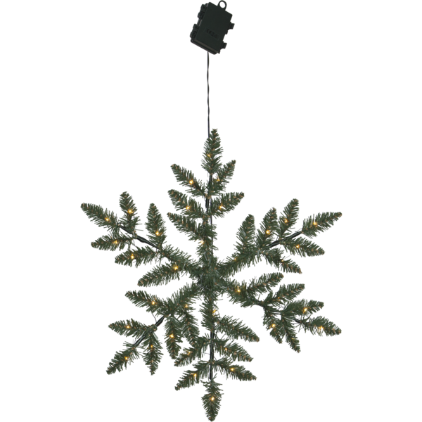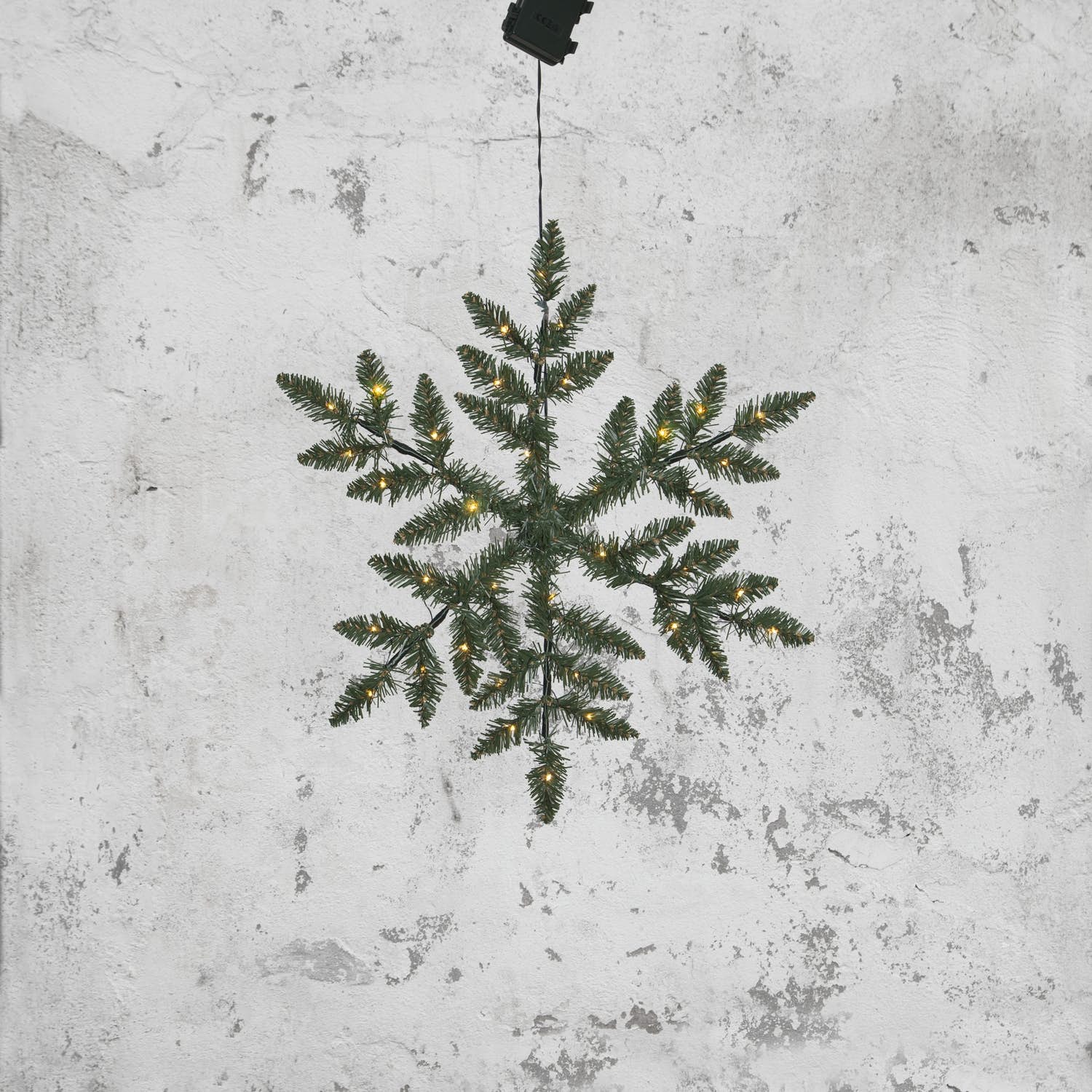 Grön krans i form av en snöflinga med 36 varmvita LED-lampor. Kransen ger ett fint och inbjudande sken i mörkret. Dekorera med kransen inomhus eller utomhus exempelvis mot en vägg eller på en dörr.