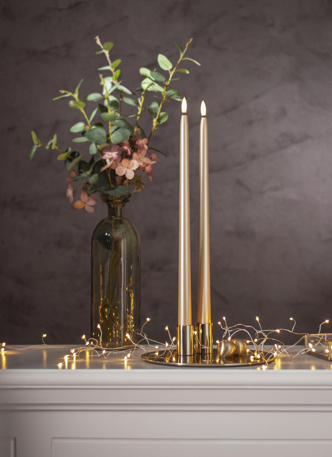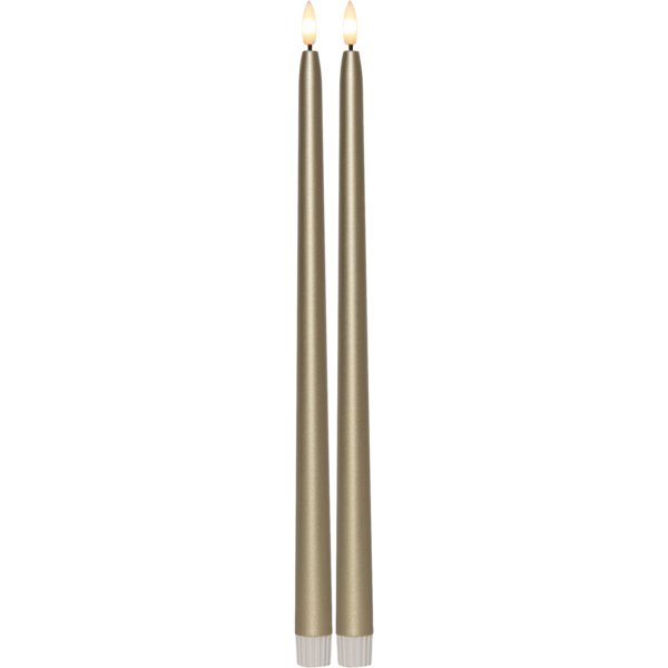 2 pack antikljus i plast med en guldskimrande yta med höjden 39 cm och diameter 2,1 cm. De drivs av 2 x 2xAAA batterier och dessa ingår ej. Ljusen lyser med varmvitt sken och har en inbyggd timer.