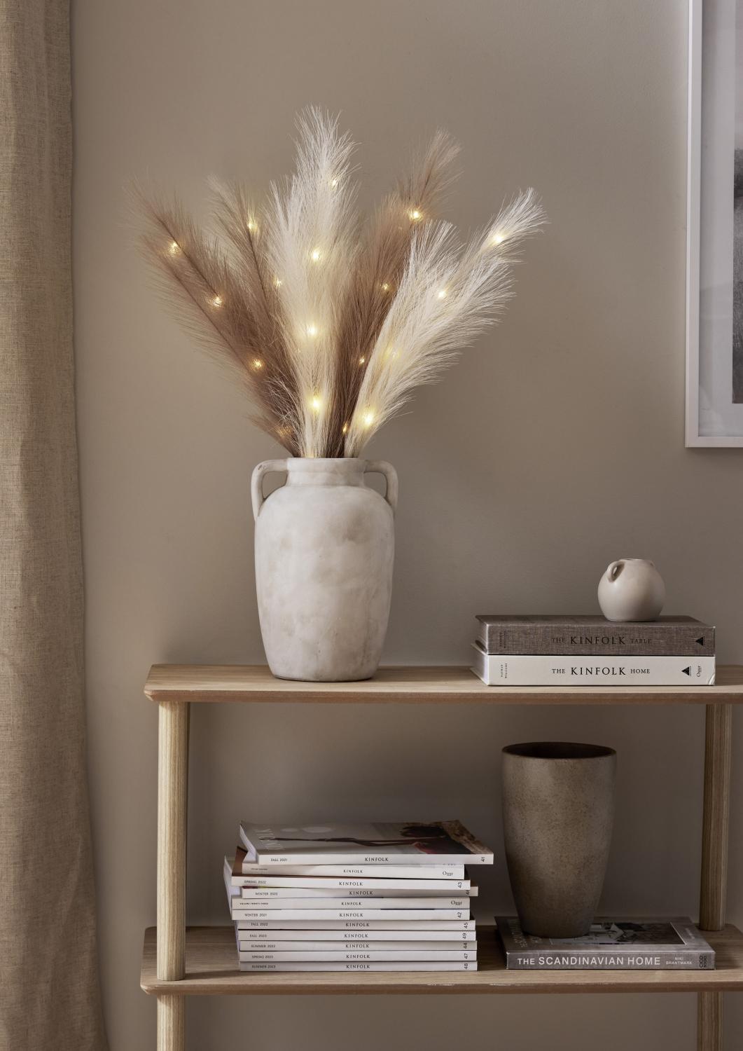 Batteridriven inomhusdekoration med konstgjorda större fjädrar i ljus beige. Kommer med tre kvistar monterade på en kabel, på varje kvist finns 5 varmvita LED för ett behagligt och stämningsfullt ljussken. Placera i hemmets mörka vrå för att lysa upp, lika fin tänd som släckt.