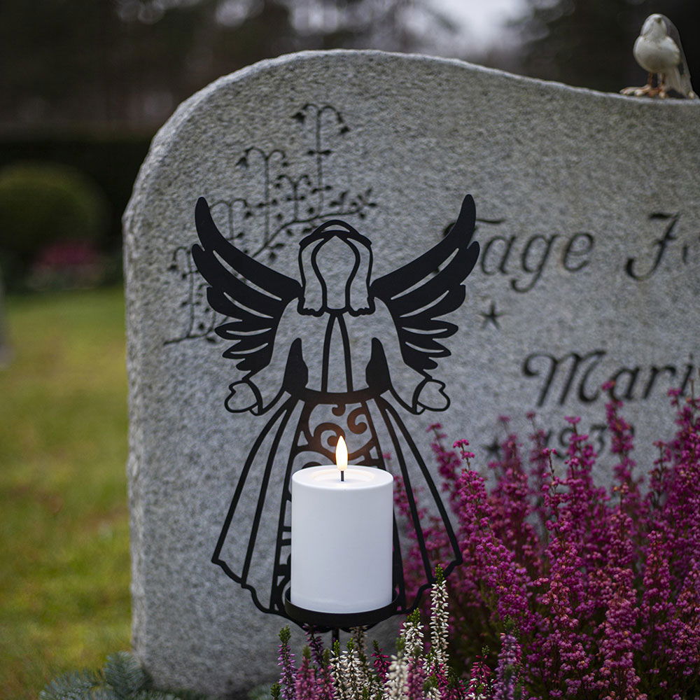 En elegant ängelsiluett med batteriljus som sprider varmvitt sken. Skapa stämningsfull belysning med denna unika LED-dekoration! Perfekt dekoration för trädgård, minnesplats eller grav. Ljuset har extra lång brinntid på ca 2500 timmar och drivs av 2 st C batterier, dessa ingår ej.