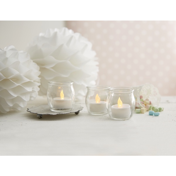 3-pack gaslyktor med värmeljus. Ljusen har en flimrade lågan som ger ett verklighetstroget utseende. Perfekta för att lysa upp och skapa en mysig stämning i huset. Drives med 3 batterier CR2032 (ingår) livslängd 80 h. Mått:- Storlek 5,5x5,5x5,5 cm Färg:- transpatrent.