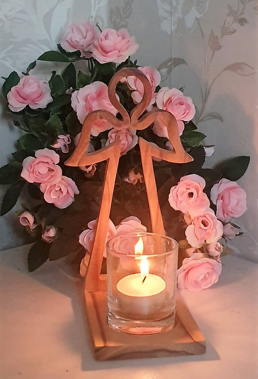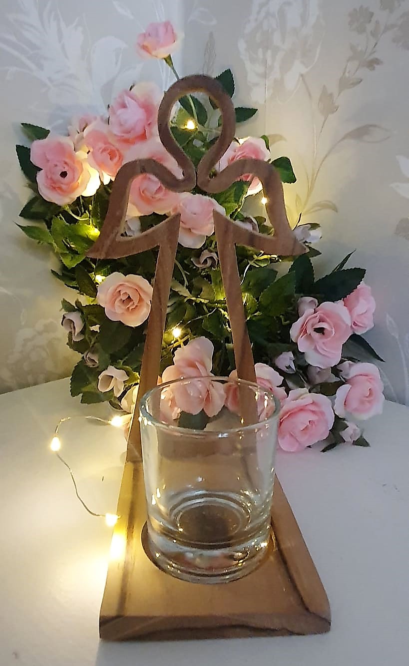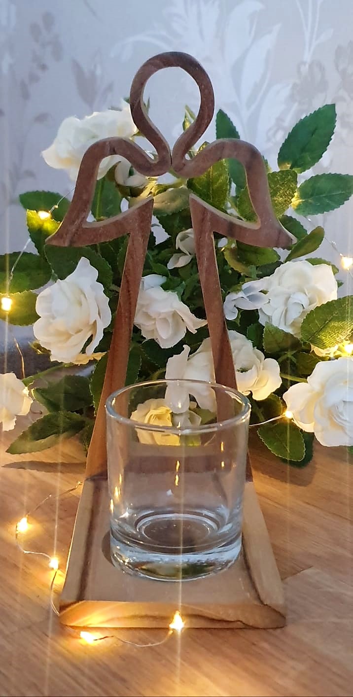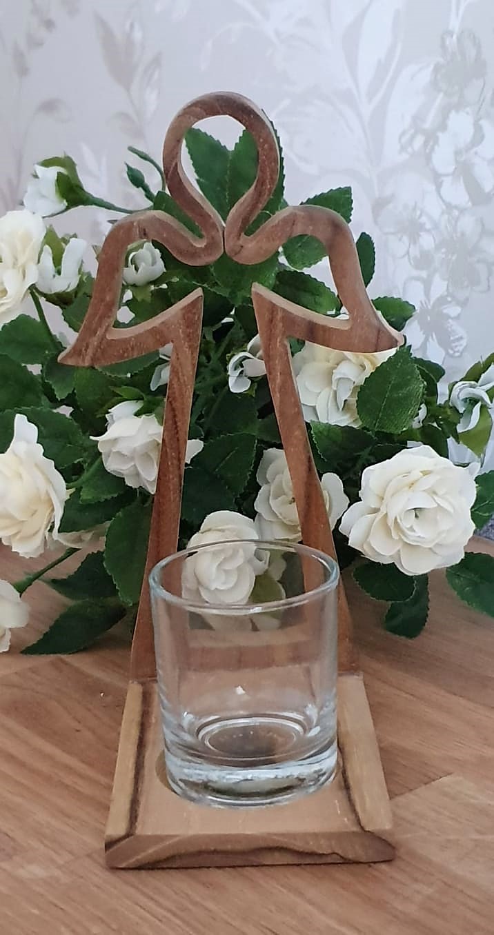 Vacker ljushållare i trä i form av en ängel med glas lykta i glas. Ljushållaren kommer inslagen i cellofan och är dekorerat med ett litet trähjärta. Perfekt att ge bort som present.