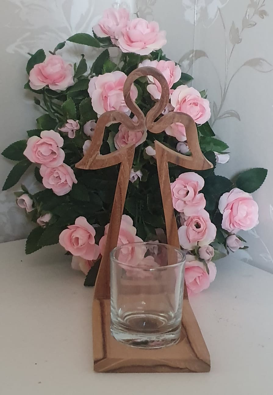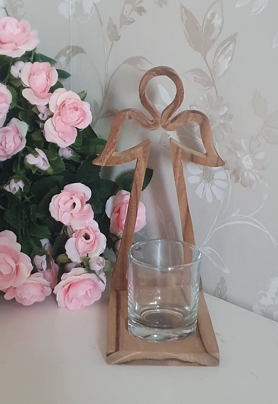 Vacker ljushållare i trä i form av en ängel med glas lykta i glas.