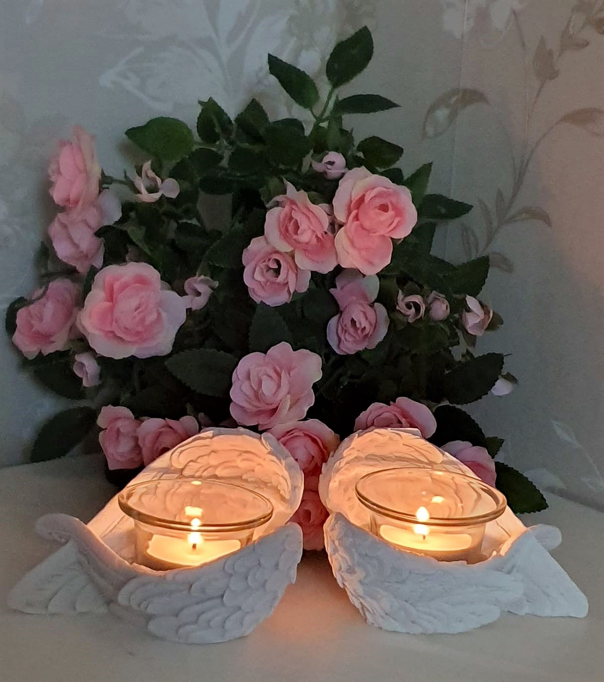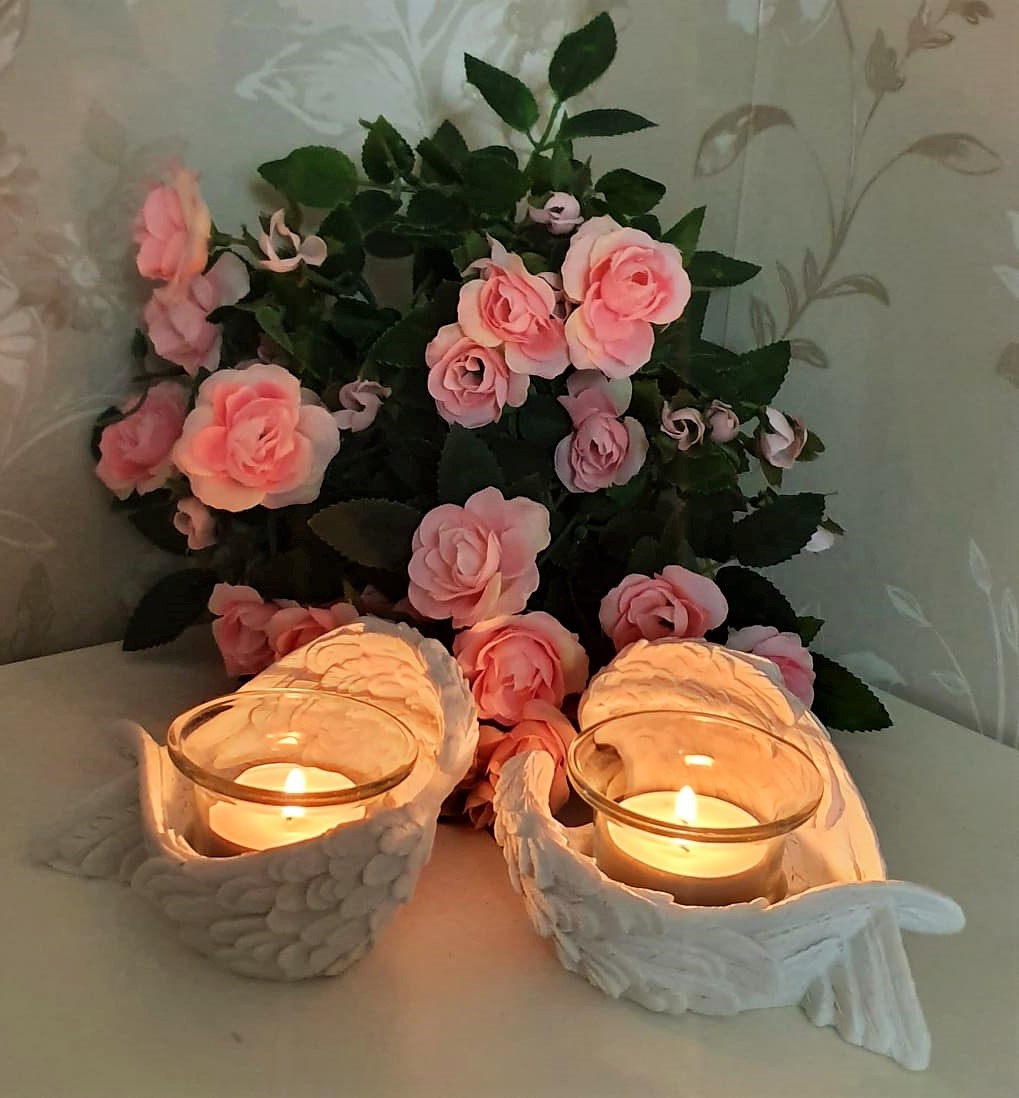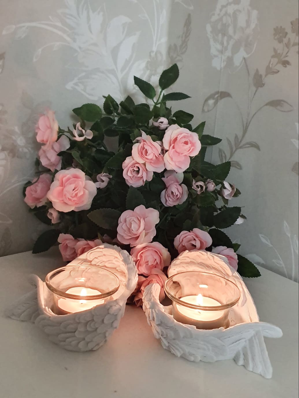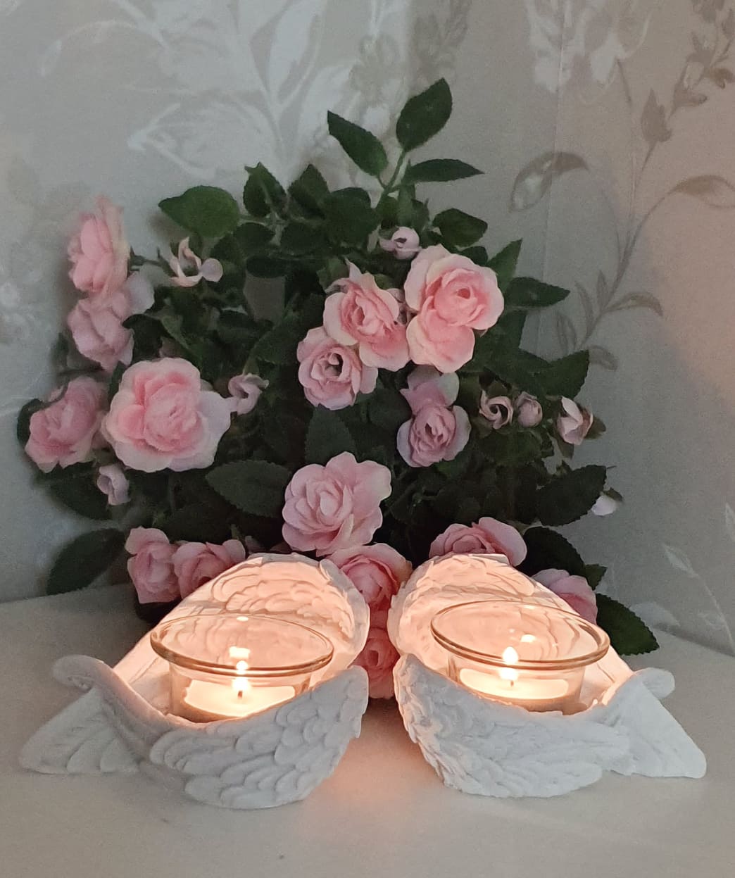Två vackra ljuslyktor av polyresin och glas i form av änglavingar.
