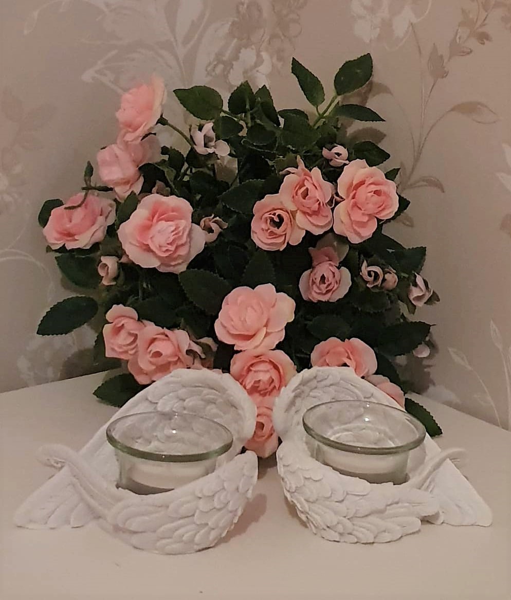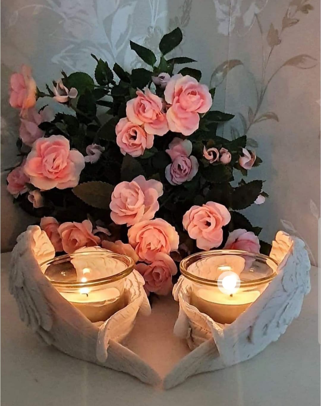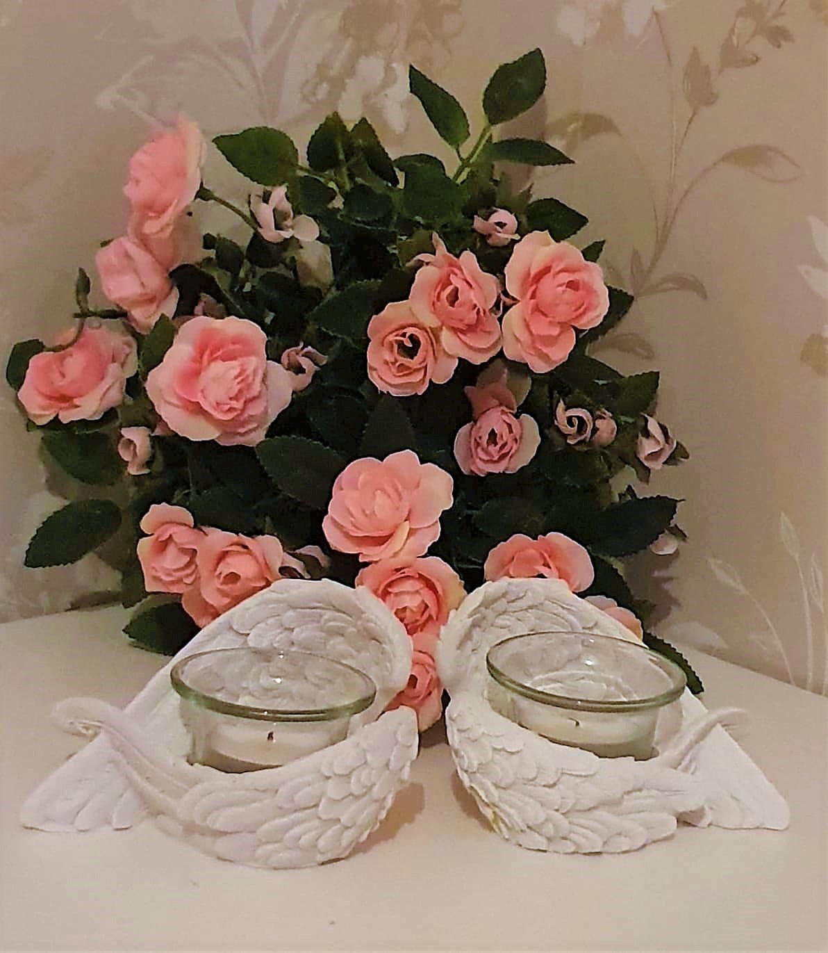 Två vackra ljuslyktor av polyresin och glas i form av änglavingar.