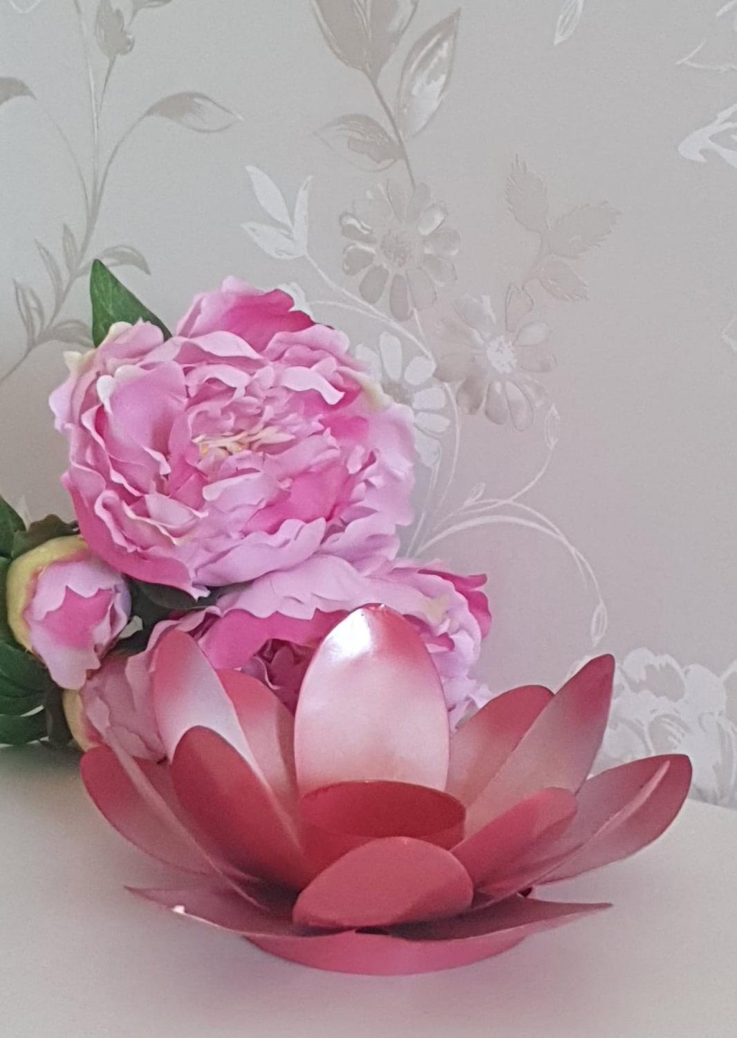 Mycket vacker ljushållare i hamrad plåt i form av en blomma i underbar rosa färg.