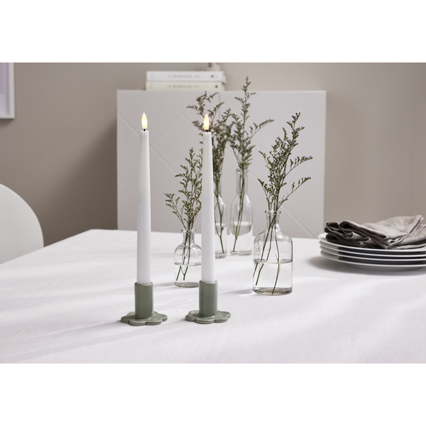 Bloom är ett 2 pack ljushållare för levande ljus eller batteriljus i storleken 7,5x6 cm. Gjord av porslin i en mildgrön färg. Innerdiametern på ljushållaren är ca 23mm.