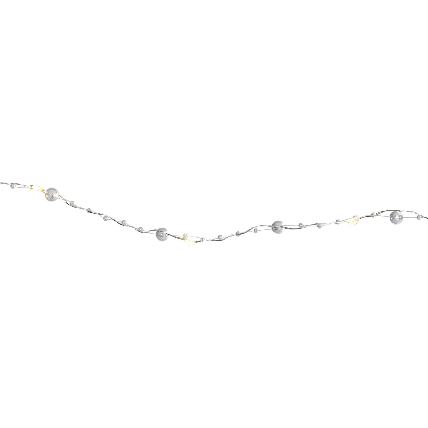 Fin batteridriven ljusslinga med ett transparent pärlband som sitter på en silverfärgad slinga. Den har 20 stycken små LED-lampor som sprider ett stämningsfullt och varmvitt ljus. Du kan använda ljusslinga till många olika dekorationer. Vira den runt en vacker växt, lägg den i en glasskål eller placera den i ett fönster. Du kan även använda ljusslinga till en vacker dukning. Den är 190 cm lång och har en maxeffekt på 1,2 watt. Du kan lätt ställa in när ljusslingan ska lysa med slingans timer. Den lyser i 6 timmar och är sedan släckt 18 timmar. Slingan tänds sedan igen automatiskt igen efter 18 timmar, alltså samma tid som den sattes på. Timerfunktionen har en vanlig på- och avknapp om du inte vill använda timern. Drivs av 3 stycken AA-batterier, som ej ingår.