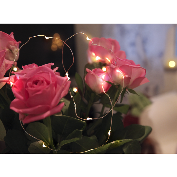 Batteridriven ljusslinga med 12 stycken LED dewdrops. Kan användas vid diverse dekorationer, vid tex dukningar, blomsterarrangemang, i fönster, på väggen osv. Slingan är silverfärgad och ljusen är varmvita.