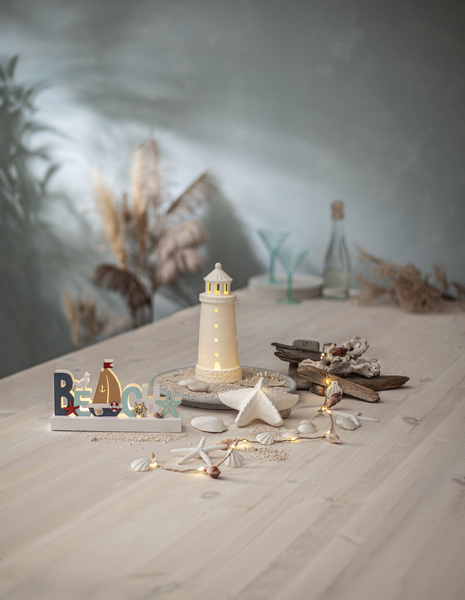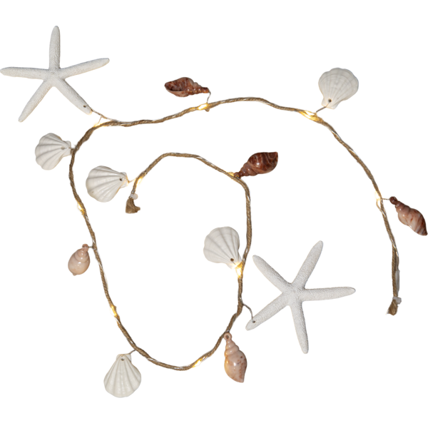 Batteridriven slinga för inomhusbruk med dekorationer i plastmaterial inspirerade av havet, bla snäckor och sjöstjärnor. 10 varmvita LED ger ett härligt sken. Juterep lindad runt den tunna metallkablen. Slingan har timerfunktion.