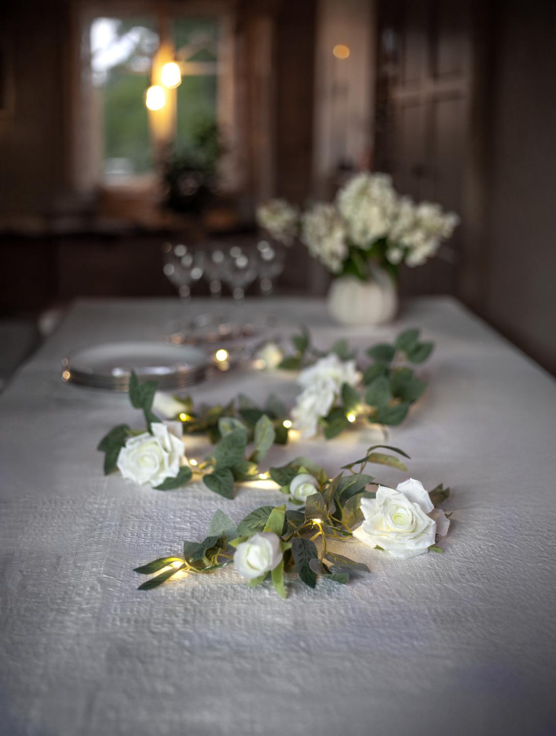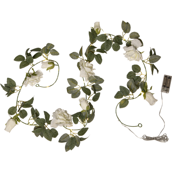 Dekorativ ljusslinga med konstgjorda rosor och blad i vit och grön färg för inomhusbruk. Tunn metallslinga med 20 varmvita ljuspunkter lindad runt blommorna. En vacker dekoration till hemmet, tex till bordsdukning. Batterdriven med timerfunktion.