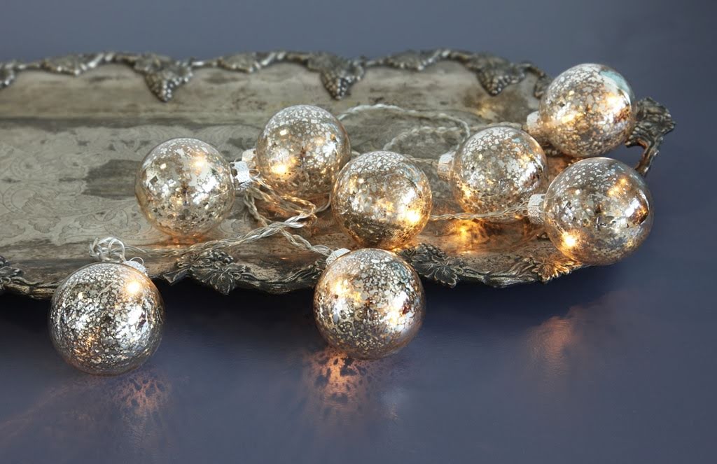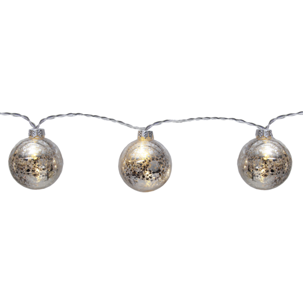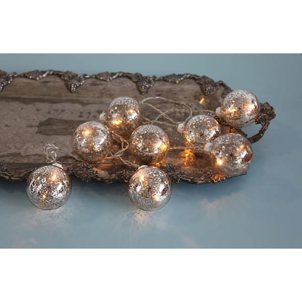 vacker ljusslinga med 8 stycken silverkulor med LED-belysning. Ljusslingan sprider ett härligt varmvitt ljus kan användas till många olika dekorationer. Slingans längd är 210 cm och har en maxeffekt på 0,24 watt.